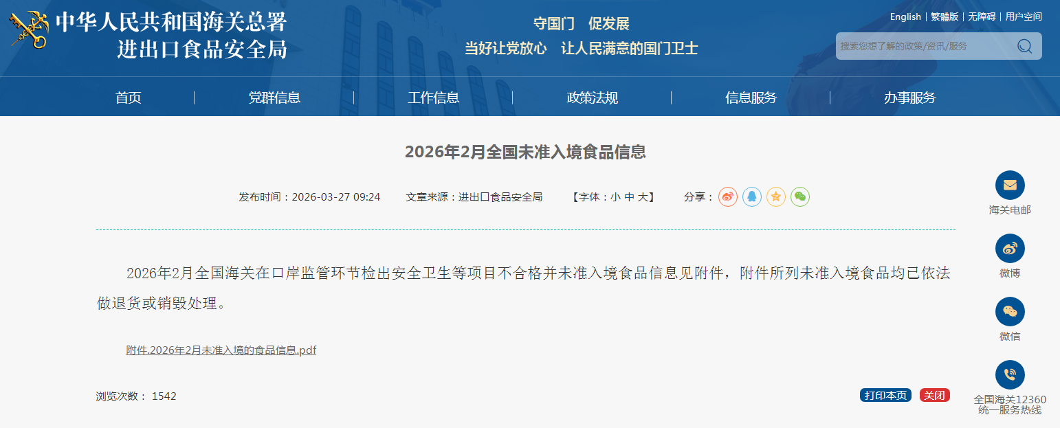 齐鲁晚报·齐鲁壹点记者于中华人民共和国海关总署进出口食品安全局“ 进口食品安全风险预警”栏获悉,3月27日,该栏发布了2026年2月全国未准入境食品信息。其中,优合集团有限公司(下称“优合集团”)上榜通报,其9批次产品未批准入境,原因包括呋喃西林代谢物、氟虫腈砜不符合食品国标;标签不合格;货证不符等。
