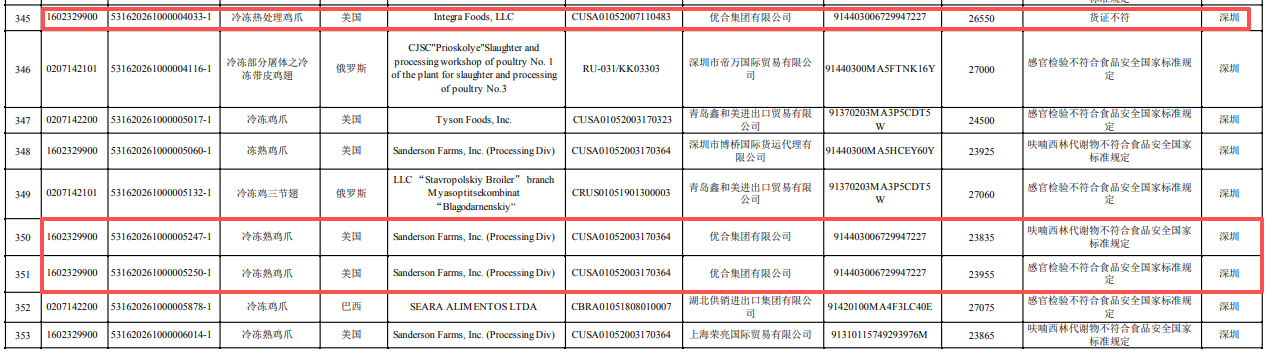 8、产品名称:冷冻热处理鸡爪;产地美国;生产企业Sanderson Farms, Inc. (Processing Div);进口商为优合集团;重量23955KG;未准入境的事实是感官检验不符合食品安全国家标准规定;进境口岸为深圳。