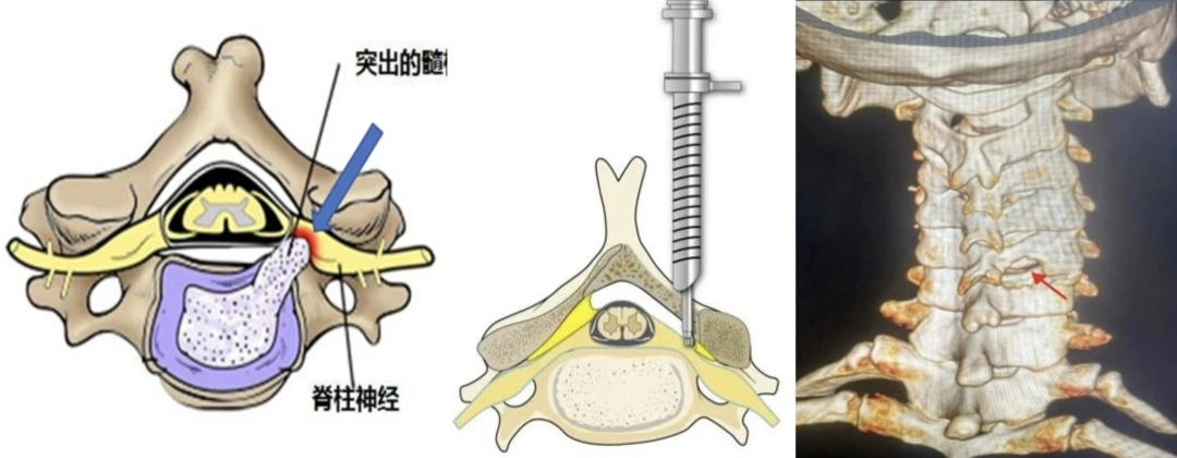疼痛医学科医疗团队在充分评估患者病情、综合考虑患者年龄、身体状况以及手术风险等因素后,决定采用在局部麻醉下行颈椎内镜下摘除颈椎间盘突出术。该手术通过在颈椎后方开一个微小切口(1cm),在椎板间隙上下椎板磨除豌豆大小的骨质、靶点置管,清晰明视下取出压迫神经突出物,实现神经腹侧背侧彻底减压。术后患者即刻感觉疼痛缓解,次日即可下床活动,一周后恢复日常生活。
