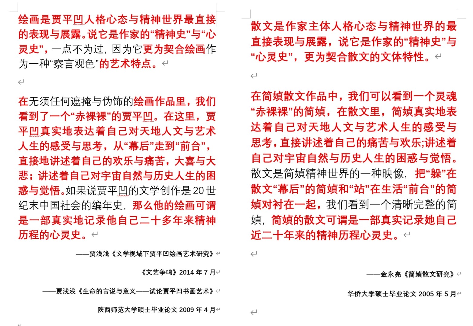 贾浅浅则比较例外,她以“研究父亲”为己任,在贾平凹相关研究机构任职,并写文章称父亲指导其论文是“历史上不多见的,被研究者指导研究者如何写研究文章的一个场面”。贾浅浅的硕士毕业论文、重要期刊论文研究的都是贾平凹的书法、绘画、小说等。更诡谲的是,有了被研究对象的亲身指导,有研究对象的一手资料优势,可以通过面对面深度访谈、查阅写作日志和手稿等获得独特的研究视角和方向,但贾浅浅的论文却有诸多涉嫌抄袭的部分,甚至挪用别人对其他作家和艺术家的研究结论。这也是网友们不解之处。