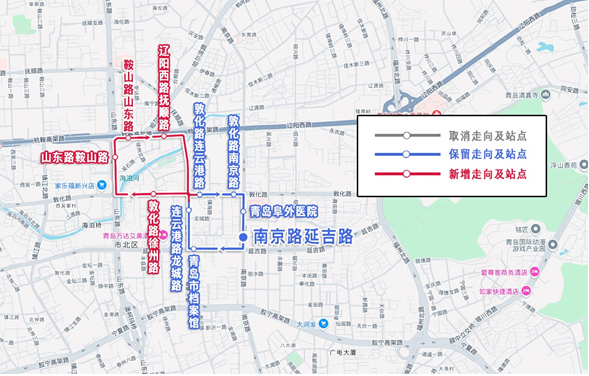 增设站:敦化路徐州路(并622路)、山东路鞍山路(并19路)、鞍山路山东路(并4路)、辽阳西路抚顺路(并4路)。