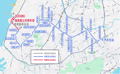 主站由汽车东站调整为瑞昌路公交停车场,副站由湖清路停车场调整为汽车东站,调整后为瑞昌路公交停车场—汽车东站。