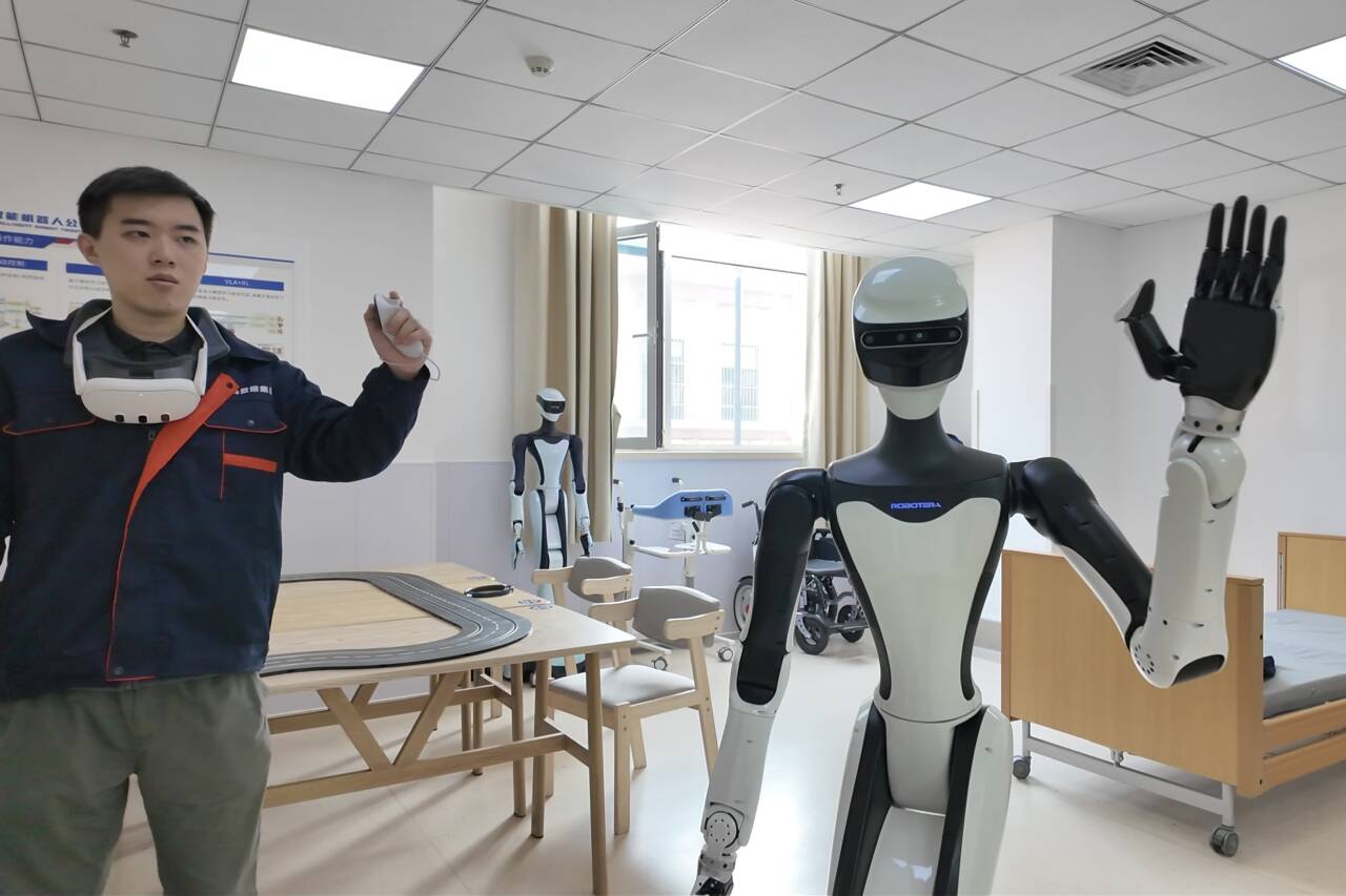 青岛市康养领域具身机器人暨智能康复类产品训练验证中心的训练区里,午后的阳光透过玻璃窗,落在星动纪元超拟人服务机器人银灰色的机械臂上,工作人员向先生戴着VR眼镜,双手在空中缓慢比画着弧线,面前的机器人随之抬起手臂,靠近桌面上的水瓶,机械关节转动,像个认真的学徒,在工作人员的示教下重复动作;而另一边,智能陪伴机器人也以不同方式“成长”,学习陪伴、巡逻、告警等技能,采集大量数据以读懂老人的习惯。这里的康养机器人目标只有一个——练出照护老人的“分寸感”。