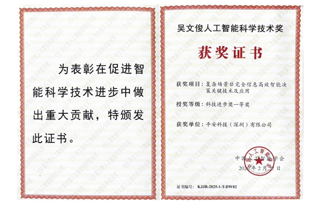 近日,由平安科技联合哈尔滨工业大学(深圳)、北京大学共同完成的《复杂场景非完全信息高效智能决策关键技术及应用》项目,凭借在博弈决策关键技术创新与在金融、经济等产业应用的突出成果,荣获2025年度吴文俊人工智能科技进步奖一等奖。据悉,该奖项评选方表示,本次获奖展示了中国平安在金融知识图谱、风险预测与博弈决策等关键金融科技领域的前瞻布局与领先优势,也体现了企业与高校“产学研用”一体化创新的机制优势。