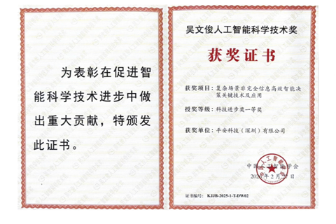 据介绍,“吴文俊人工智能科学技术奖”被誉为“中国智能科学技术最高奖”,是经国家科学技术部批准设立,由国家级学会—中国人工智能学会(CAAI)发起主办,旨在表彰在智能科学技术领域取得重大突破、作出卓越贡献的科技工作者和项目。在此之前,2020年平安科技也曾凭借《基于时序知识图谱的金融风控与经济量化决策平台产业化》项目获颁吴文俊人工智能科技进步奖一等奖。