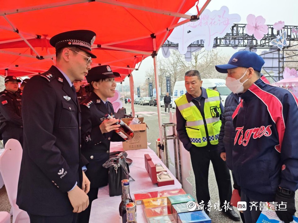 “这酒和烟都是走私过来的?”“对,这些都是我们查获的走私物品。”烟台市公安局海岸警察支队民警孙长宇在活动现场为赏花市民和游客解答疑问,“这里展示的7类30余件物品,包括名包、名表、电子产品、烟、酒、化妆品等都是走私品,建议大家通过正规途径购买。”