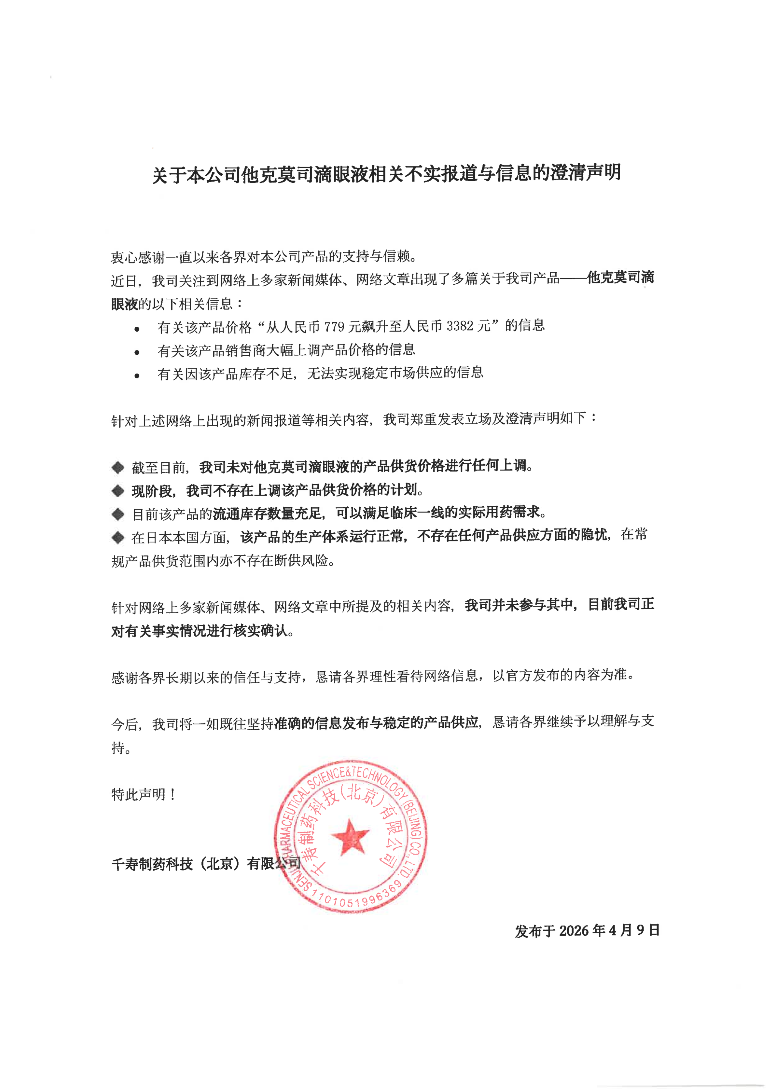 关于他克莫司滴眼液相关不实报道与信息的澄清声明大众报业·齐鲁壹点 2026-04-09 22:08:064月9日,千寿制药科技(北京)有限公司发布一则《关于本公司他克莫司滴眼液相关不实报道与信息的澄清声明》,内容如下。责任编辑:孔令茹