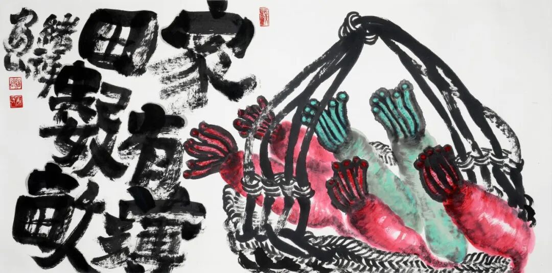 此次展览以“云外家山”为核心主题,是唐绪祥先生“以笔墨回望故土、以初心对话山河”的艺术集萃。创作中,他娴熟驾驭水墨、纸张等传统画材,精于画面构图与位置经营,山水重墨、果蔬重彩,墨色精妙、层次分明,构建出兼具“梦里家山”的悠远意境与“烟火日常”的温润质感的精神世界,成为当代艺术家以笔墨重构精神家园、阐释传统艺术的典型范例。正如山东工艺美术学院院长董占军教授所言:“唐绪祥的画,美在画面之内,意在画面之外,其以当代艺术家个体化的审美实践,诠释古人所追求的澄怀观道、卧以游之的审美体验。在瞬息万变的数字时代,其画中自有一份难得的深情守望与庄子逍遥游般的洒脱境界。”