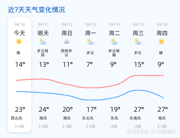 明天是4月11日,星期六,天气将由晴转为多云转阴,气温有所上升,最高气温可达24℃,最低气温13℃。与今日相比,明日天气状况稍有变化,风力保持在3-4级,市民出行时需注意天气变化。