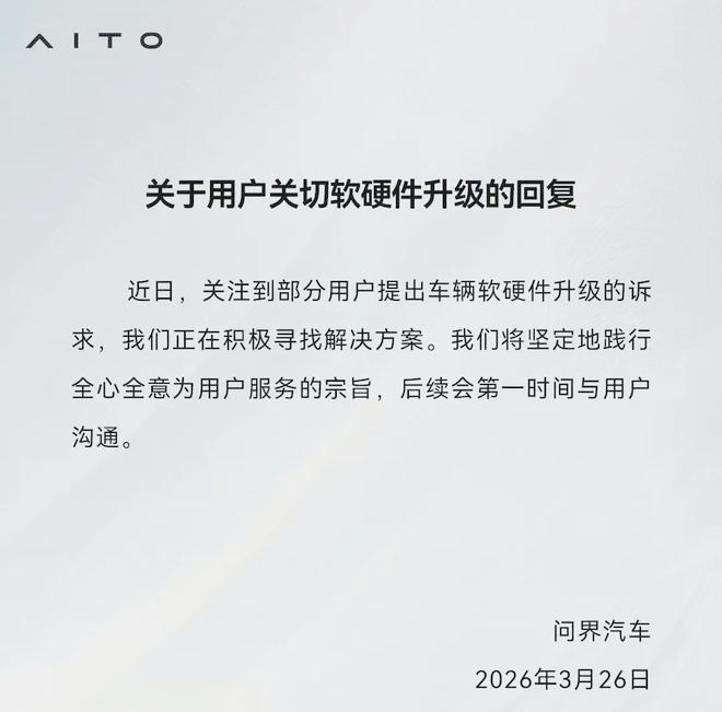 老车主吐槽的“背刺”问题愈演愈烈,3月26日,问界汽车终于发布了《关于用户关切软硬件升级的回复》,表示“关注到部分用户提出车辆软硬件升级的诉求,我们正在积极寻找解决方案。我们将坚定地践行全心全意为用户服务的宗旨,后续会第一时间与用户沟通”。