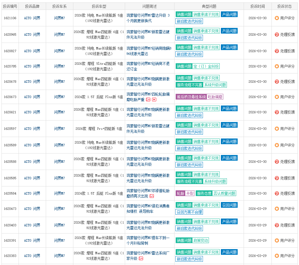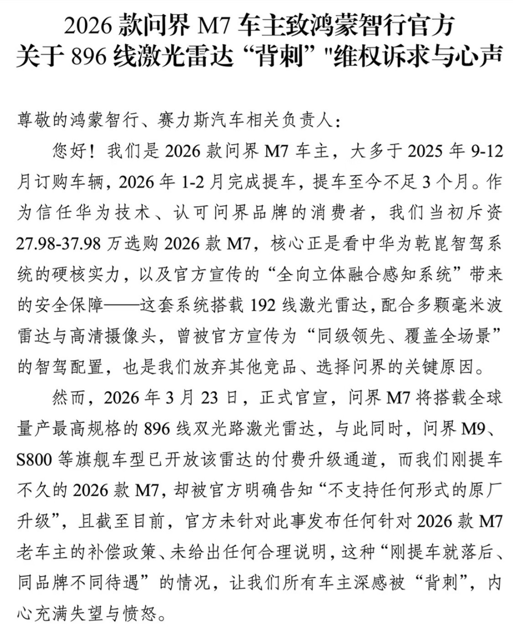 矛盾的爆发源于2026年3月23日举行的华为春季全场景新品发布会,在该发布会上,华为官宣问界M7将搭载全球量产最高规格的896线双光路激光雷达,与此同时,问界M9、S800等旗舰车型已开放该雷达的付费升级通道,而刚提车不足3个月的2026款M7车主,却被厂家明确告知“不支持任何形式的原厂升级”,且截至维权信发布时,厂家未给出任何补偿政策与合理说明。