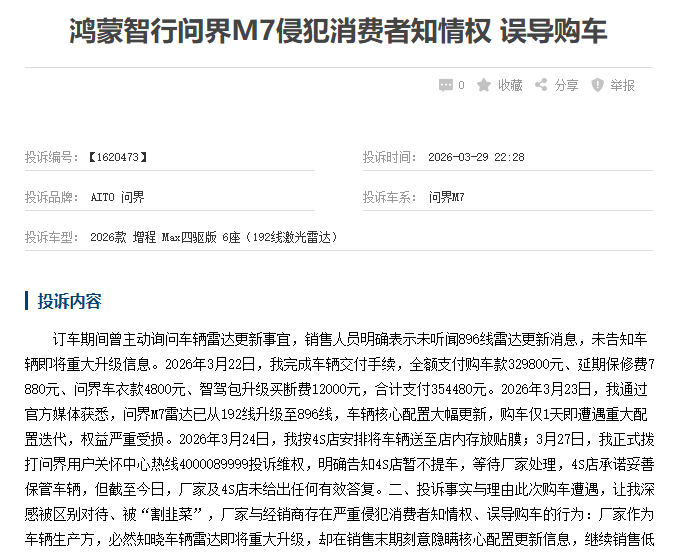 其中,一位购买了问界M7 2026款 增程 Max四驱版 6座(192线激光雷达)的车主表示,他是3月22日完成车辆交付手续,共计花费了35.44万元,结果仅仅一天之后,其通过媒体获悉,问界M7的激光雷达从192线升级至896线,购车仅1天就遭遇配置重大迭代,权益严重受损,深感被“割韭菜”。随后,他通知4S店暂不提车,等待厂家处理,但厂家与4S店均未给出有效答复。另有车主表示,他是去年12月提的问界M7,但在今年3月厂家宣布新款车型标配896线激光雷达后,老款车型无法升级,且没有任何补偿措施。厂家长期宣传“常用常新,软硬件可升级”,如今已构成虚假宣传。