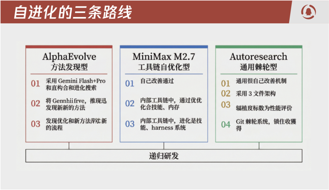 这里一共有三条路径,他们都有耀眼的结果数据。AlphaEvolve 回收全球 0.7% 算力,Minimax M2.7 在 100+ 轮自主迭代后内部评测提升 30%,Karpathy 的 Autoresearch 一晚跑 50 个实验。