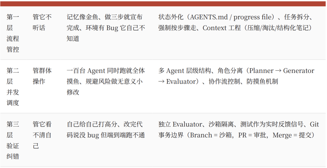 第二层,并发调度,专治群体摸鱼。一百台 Agent 同时跑,很容易全体规避风险、专挑最简单的小修改做,真正的难题没人碰。治法是多 Agent 层级结构、角色分离(Planner 规划 → Generator 生成 → Evaluator 评估)、防摸鱼机制。