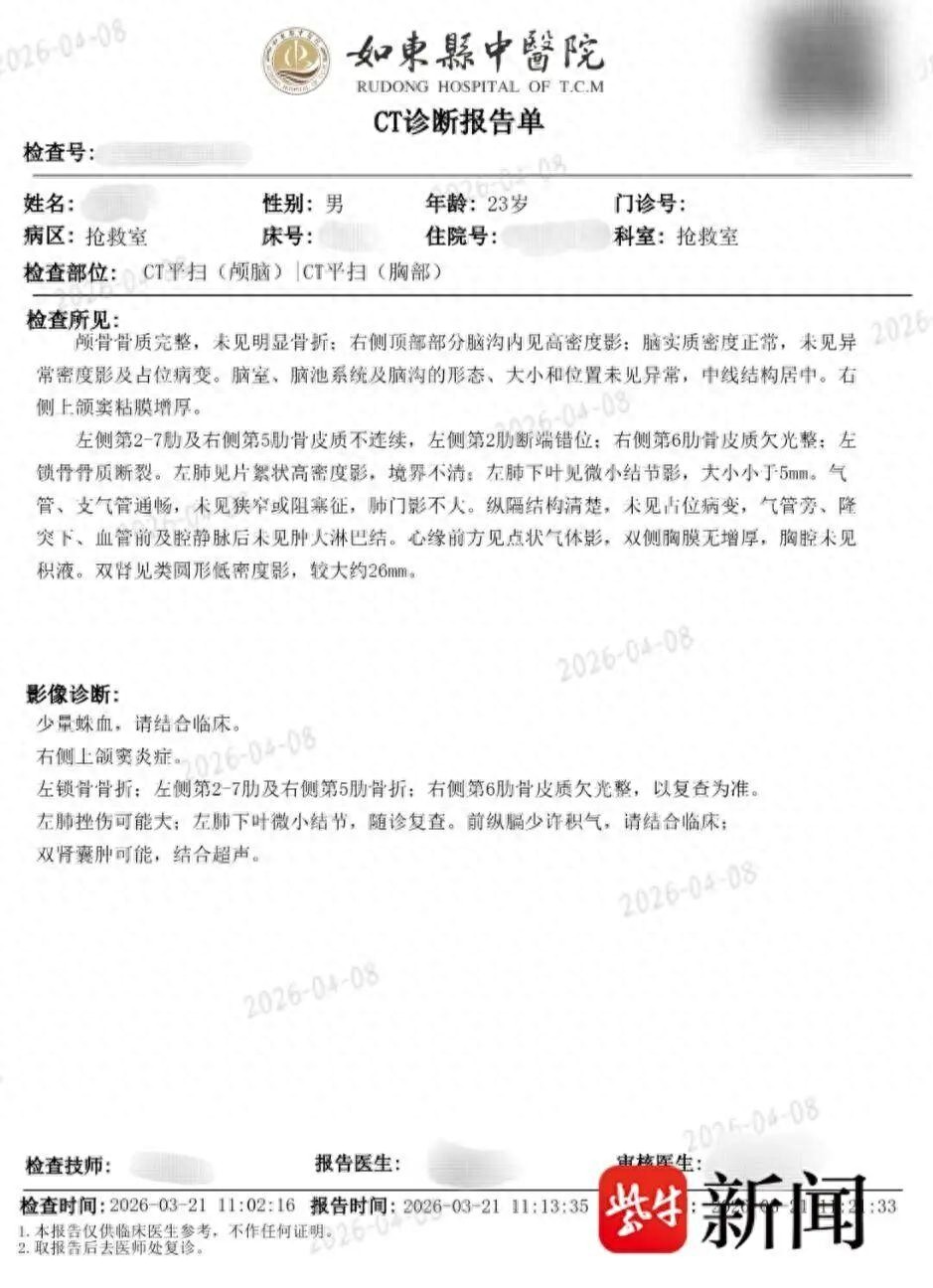 近日,江苏南通的林先生向记者反映称,自己于2025年12月在如东县金昌驾校报名学车,2026年3月21日练车途中遭遇车祸。事发时,一辆货拉拉货车与教练驾驶的从考场租赁的考试车相撞,车上共4位学员,他的伤势最严重,经如东县中医院诊断为颅内出血、锁骨骨折和肋骨骨折。