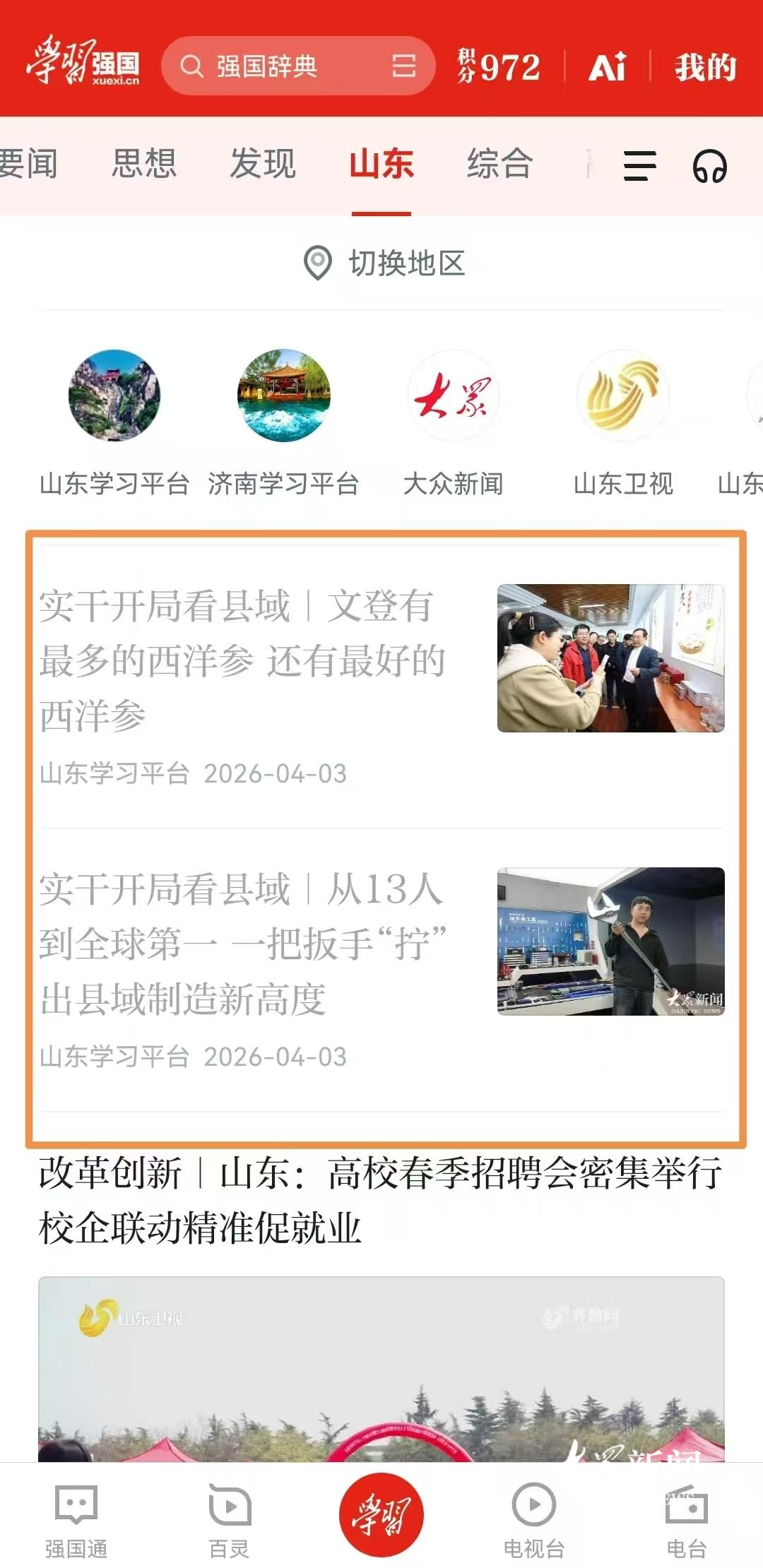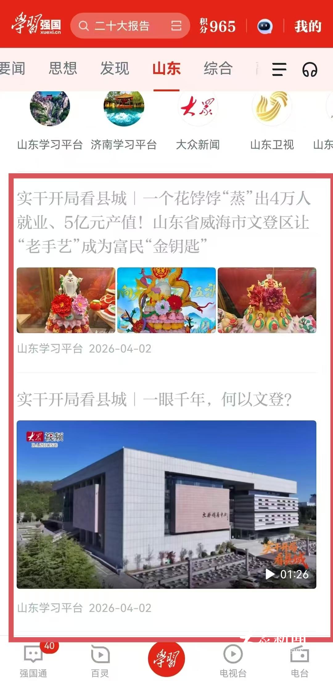 4月1日-3日,大众日报·大众新媒体大平台联合省市县三级融媒力量走进威海市文登区,以“实干开局看县域”为主题开展联合共创活动,从历史与传承、生态与人居、产业与发展等角度,呈现文登区县域高质量发展的奋进之路。两天的采访中,记者团队共采制短视频、图文、述评、海报等中英文全媒体产品39件,全网总传播量达2056万次。其中,在学习强国山东平台的专题阅读量达298.77万次,2件作品阅读量40万+、2件作品阅读量20万+;微博端协同作战,4件作品冲上同城热搜,1件跻身山东区域热搜。