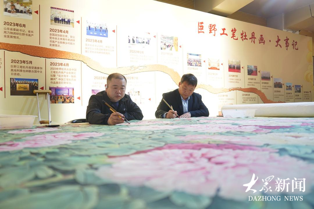 作为巨野文化最鲜明的标识,巨野工笔牡丹画自20世纪70年代起步,历经数十年发展,已构建起集创作、培训、展示、销售于一体的工笔牡丹画完整产业链条,从“纸上繁花”成长为“富民之花”,走出一条带动万千农民执笔增收的乡村文化振兴之路,成为菏泽对外文化交流的亮丽名片。