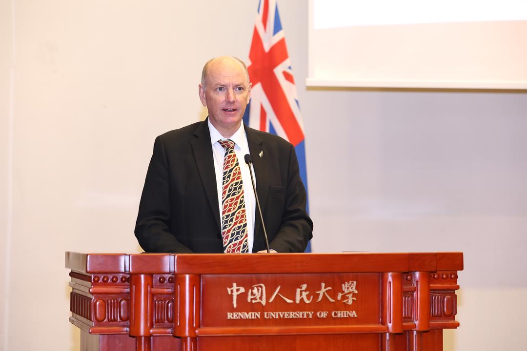 当天,乔文博做客中国人民大学重阳金融研究院区域国别论坛之“大使讲坛”第十六场,围绕“新西兰与中国:全球变化中的关系”发表主题演讲,中国人民大学重阳金融研究院院长、全球领导力学院院长王文主持讲座。