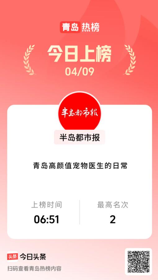 过去24小时内半岛都市报头条号这些作品登上平台热榜↓↓↓稿件《治病、捡猫、找领养……青岛高颜值宠物医生的日常,家里5只猫,其中2只是救助的,呼吁“领养代替购买”》登上青岛热榜,最高名次为第二名https://www.toutiao.com/video/7626636105051766819/