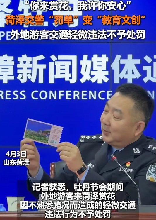 最动人的当属“柔性执法”。交通罚单变身为牡丹主题文创“温馨提示单”——违停了?先不罚,送上一张精美的牡丹卡片,提醒你规范停车。这在别处或许罕见,但菏泽敢做。不是纵容违章,而是用温情代替生硬,用引导代替训诫。一张牡丹小卡片,消解了游客的紧张,也传递了城市的善意。