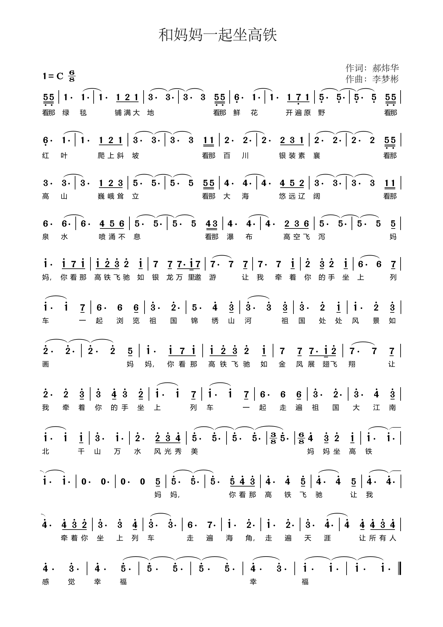 《和妈妈一起坐高铁》创作者:李梦彬演唱者:马明珠 高铁在中国发展很快,已经成为日常出行的重要方式,歌曲通过和妈妈一起坐高铁感悟作为情感载体,把中国速度和亲情结合起来。(2025济南原创音乐作品征集评选歌曲作品组二等奖)