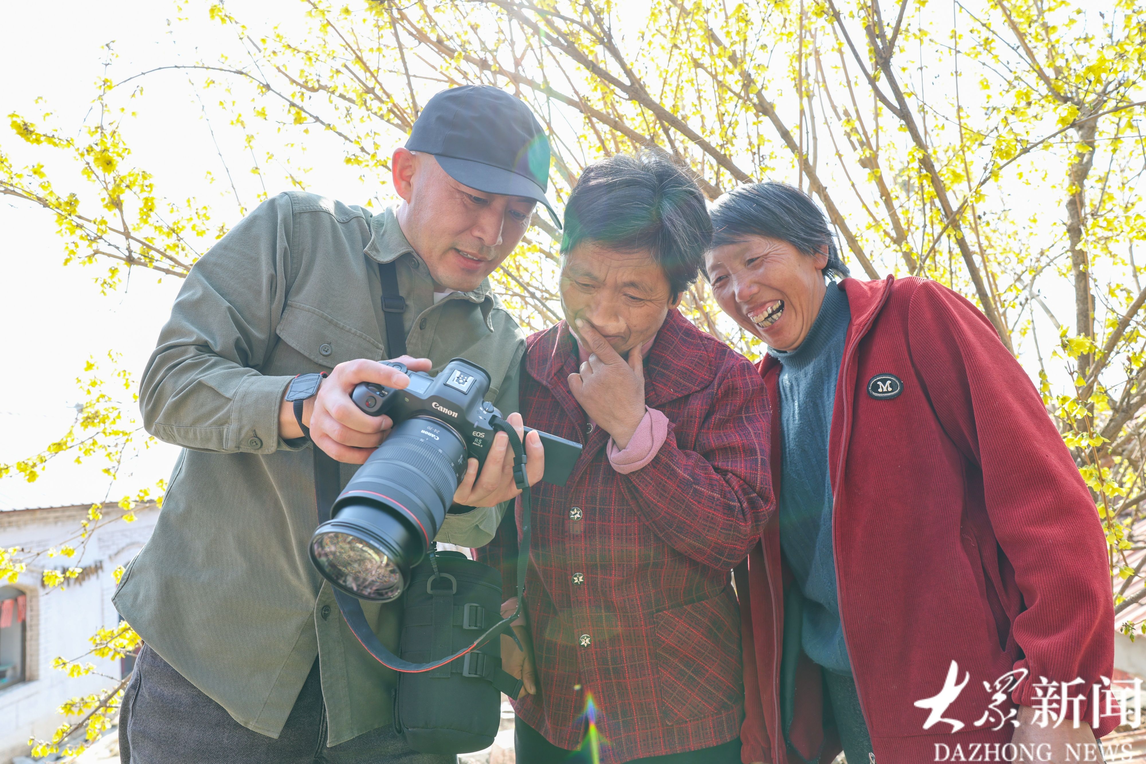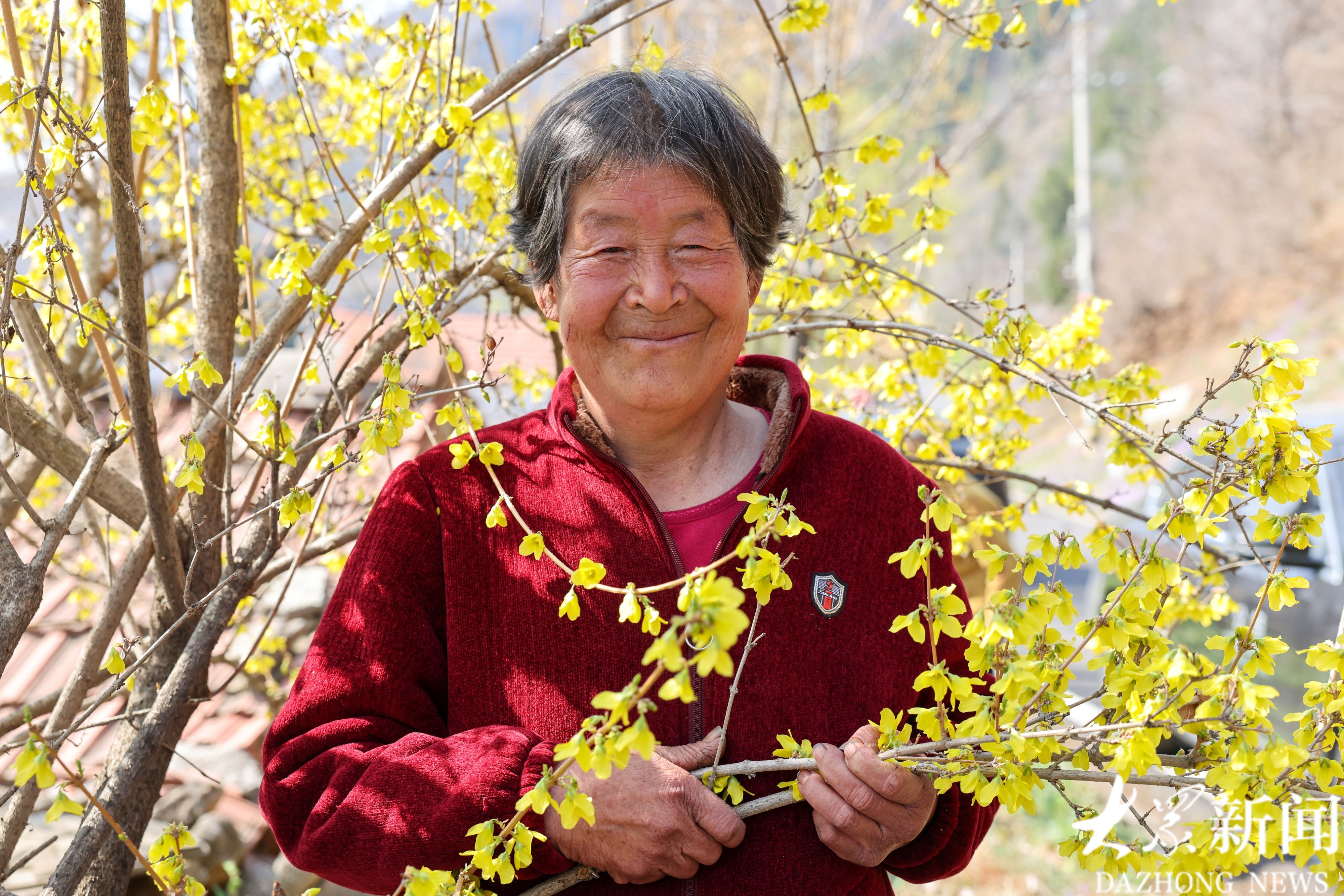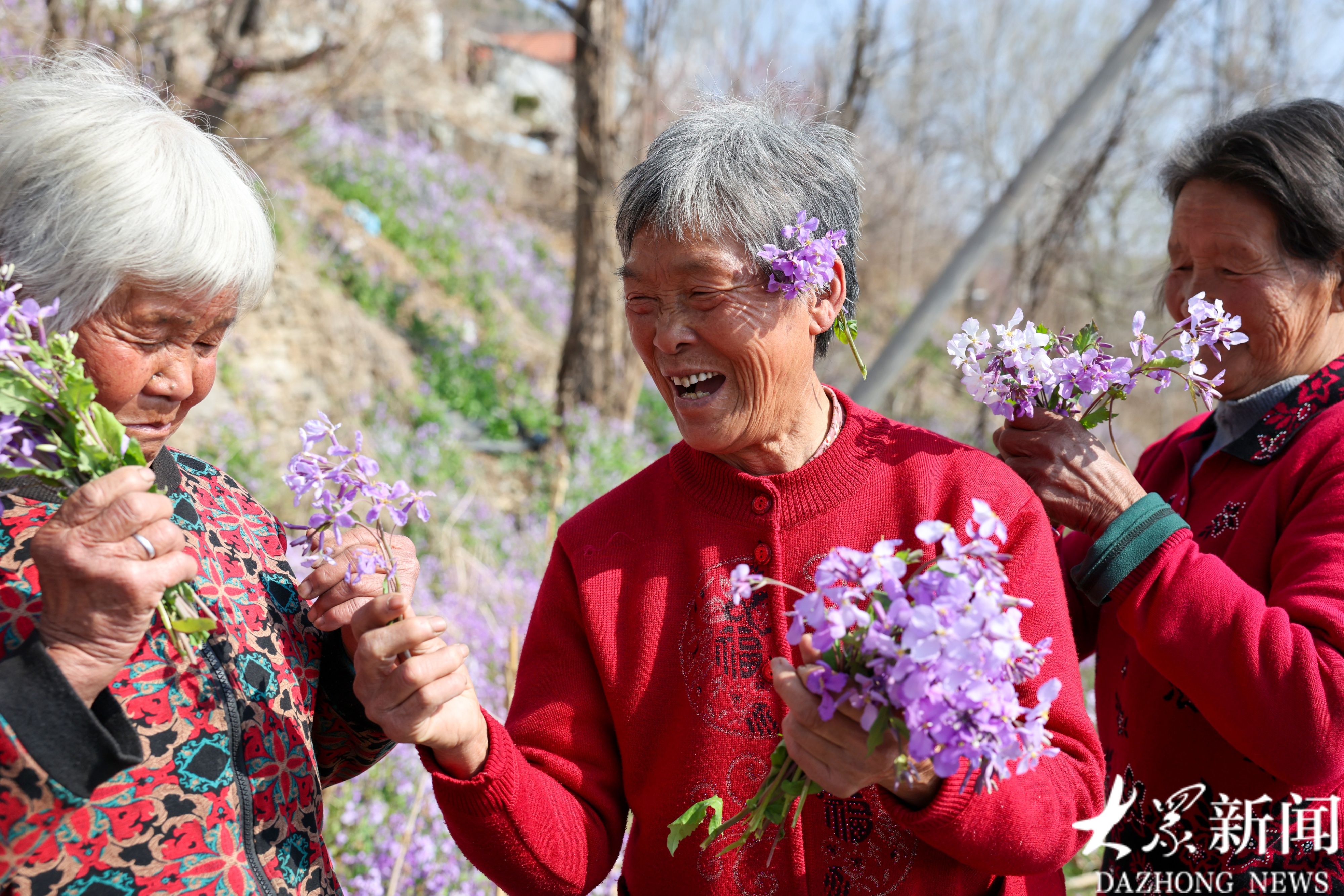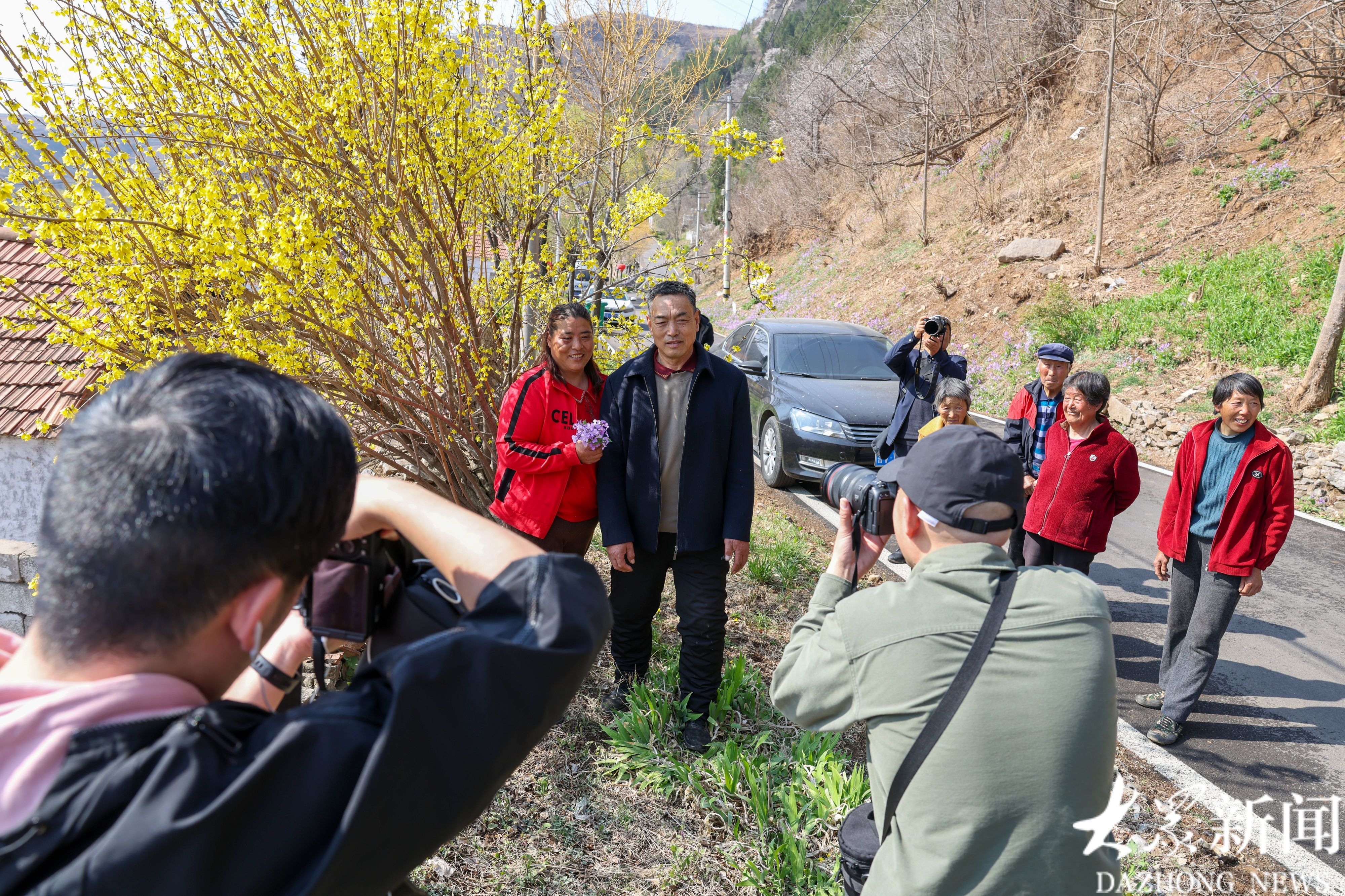 村里的二月兰、连翘、桃花都开了,“大众拍大众”为村民在花丛中留影。有了鲜花的簇拥,大家脸上的笑容更加灿烂。