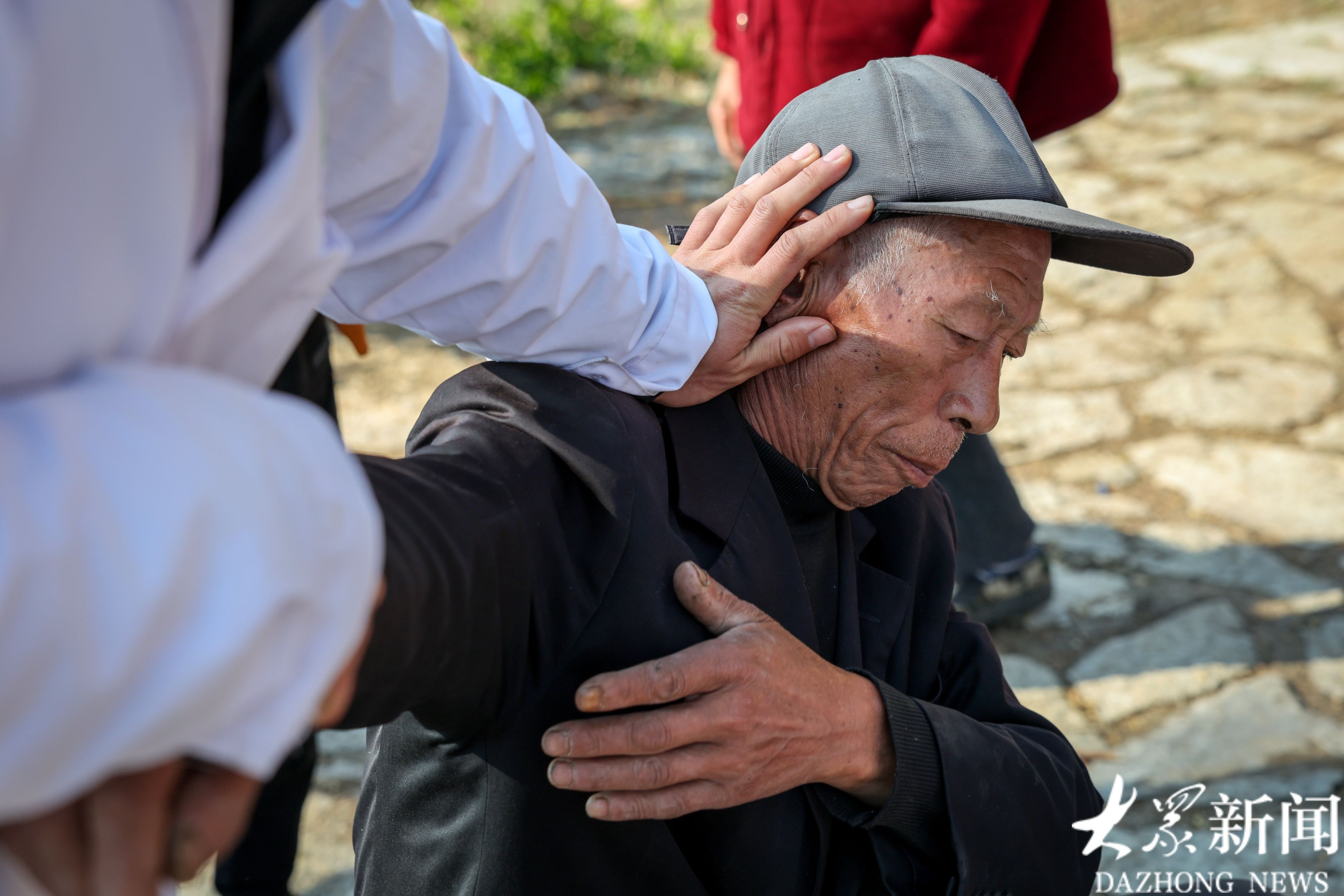 临朐县五井中心卫生院的中医窦传胜为老人现场康复理疗。几下拉扯,老人立即有了缓解。