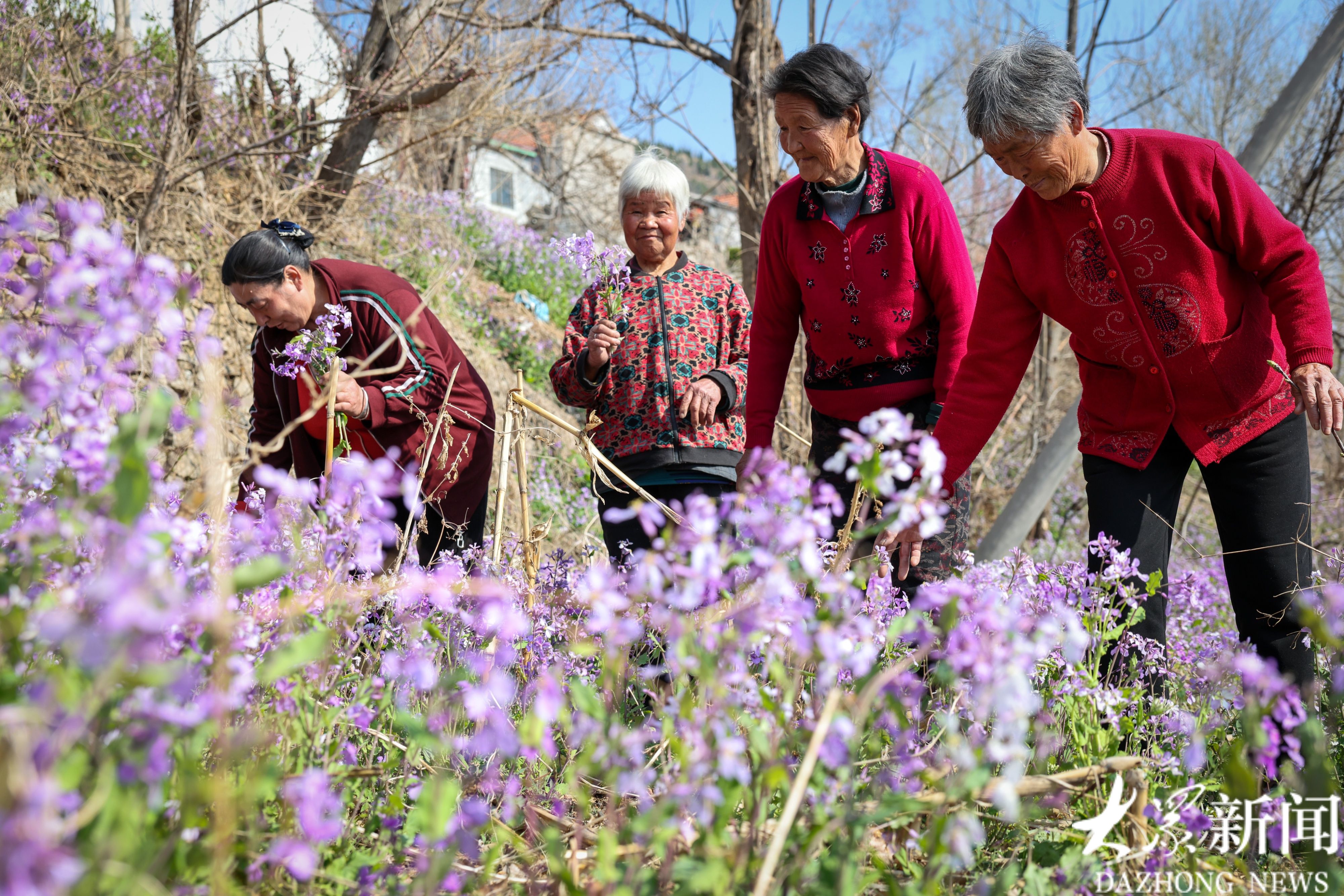 淹子岭村一片空地上的二月兰开了,像给山坡披上了紫色的绒毯,老姐妹们漫步其间,感受春光。