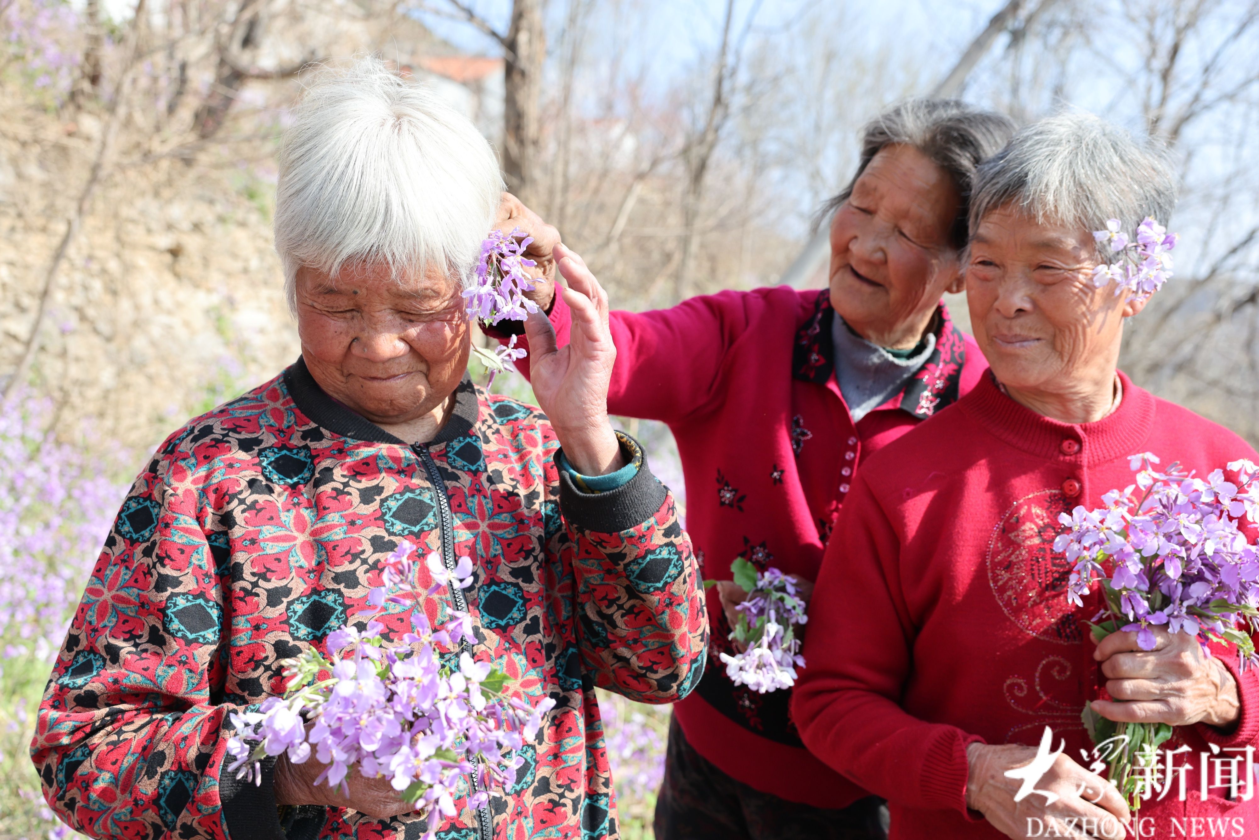 村里房前屋后都是盛开的花,本报记者和公益摄影师为村里老人拍照。花开得正艳,拍照正当时!