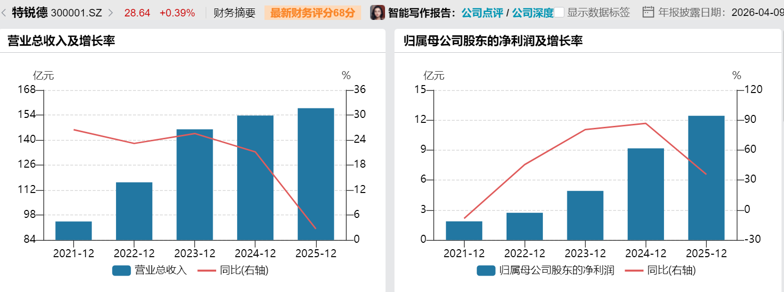 4月8日晚,“创业板第一股”特锐德披露2025年年报称,2025年公司实现营业收入157.86亿元,同比增长2.68%;实现归母净利润12.43亿元,同比增长35.62%;实现扣非归母净利润10.35亿元,同比增长35.46%。