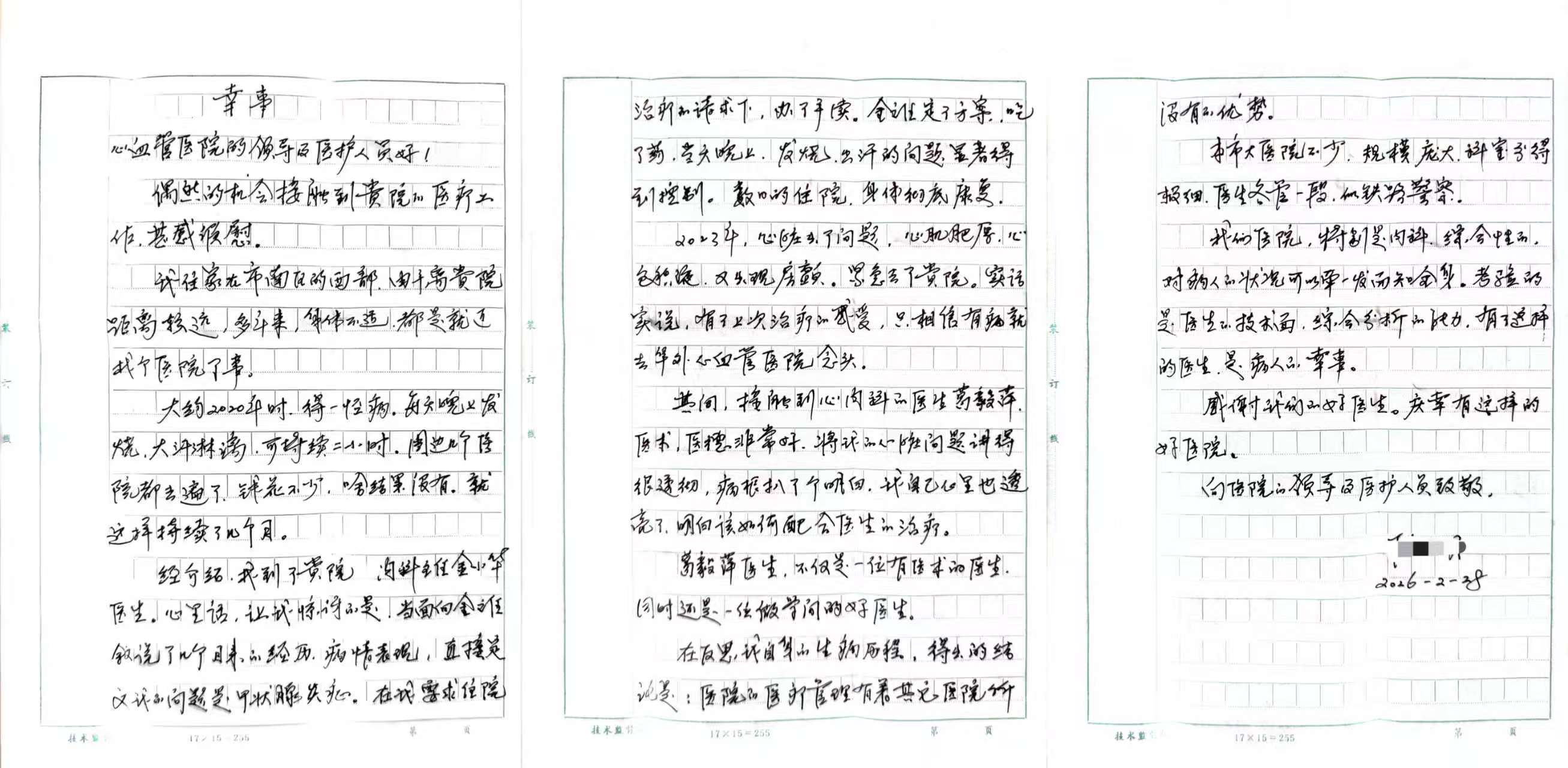2023年,段先生突发心脏急症,被诊断为心肌肥厚、心包积液并伴有房颤,病情十分危急。这一次,他毫不犹豫,再次选择来到青岛心血管病医院接受治疗。心内科副主任医师葛毅萍接诊后,一方面完善各项检查、精准制定诊疗方案,另一方面用通俗易懂的语言,将复杂的心脏病情讲解得清晰透彻,让患者对自身疾病了然于心,也更安心配合治疗。之后多次在青岛心血管病医院的就医过程,段先生都很满意,带着这种深厚的医患情感,他亲笔手写了这封感谢信。
