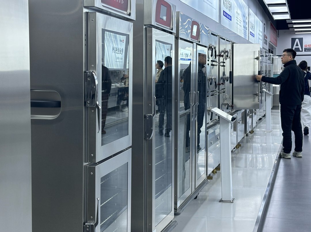 4月9日,总编记者们来到山东金佰特商用厨具有限公司。“没想到一家厨具企业,竟然把物联网、AI和VR都玩转了。” 在万能蒸烤箱演示区,工作人员通过手机APP远程操控设备,烤箱内置的传感器可自动识别食材并匹配最佳烹饪曲线。嘉宾们还亲身体验了“厨链”设计软件——戴上VR眼镜,就能“走进”尚未建成的厨房,实时调整设备布局。“这种数字化手段,能帮餐饮企业节省大量时间和改造成本。”一位财经媒体记者感叹道。