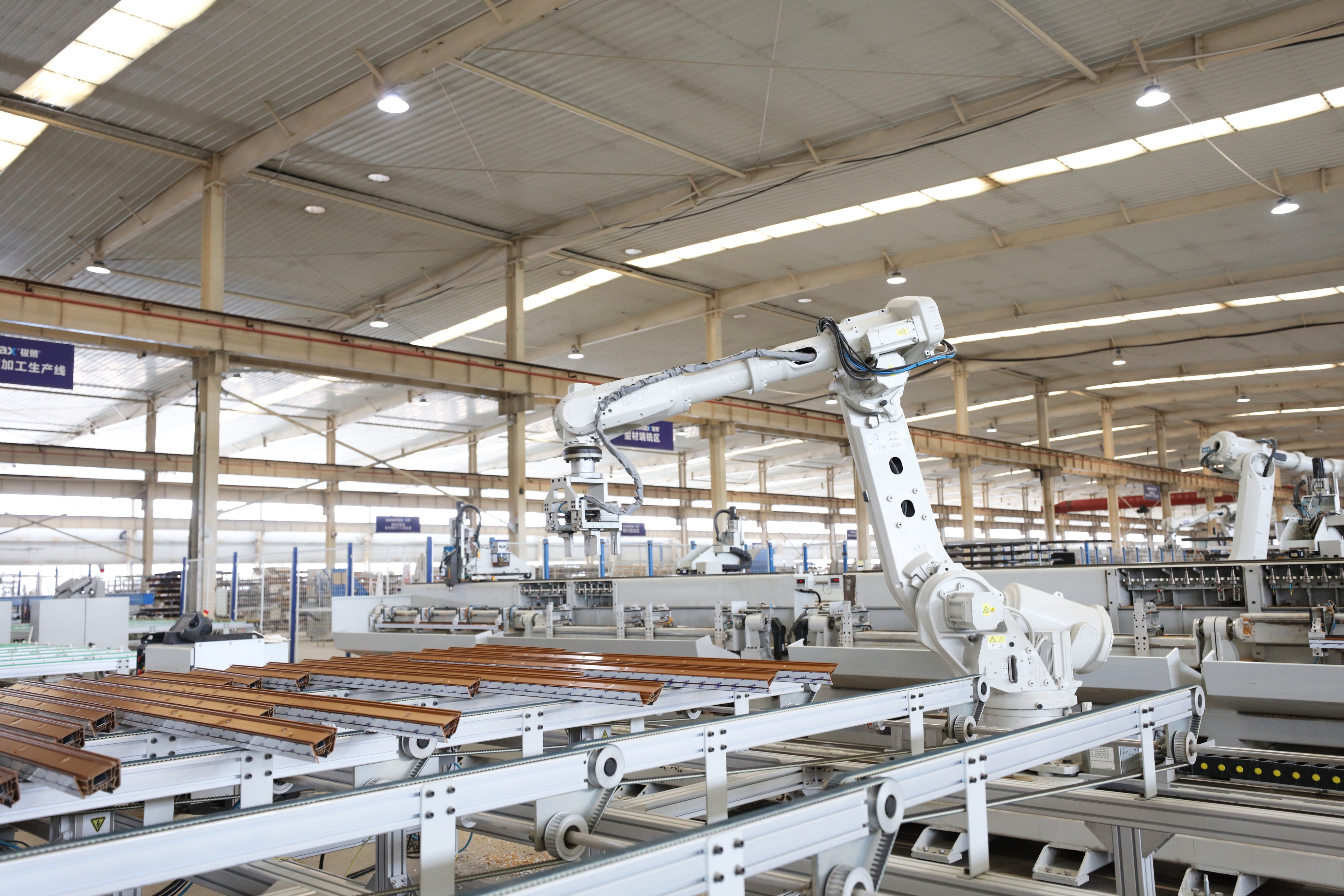 在阳谷极景门窗有限公司生产车间,机器人生产线正进行门窗加工组装