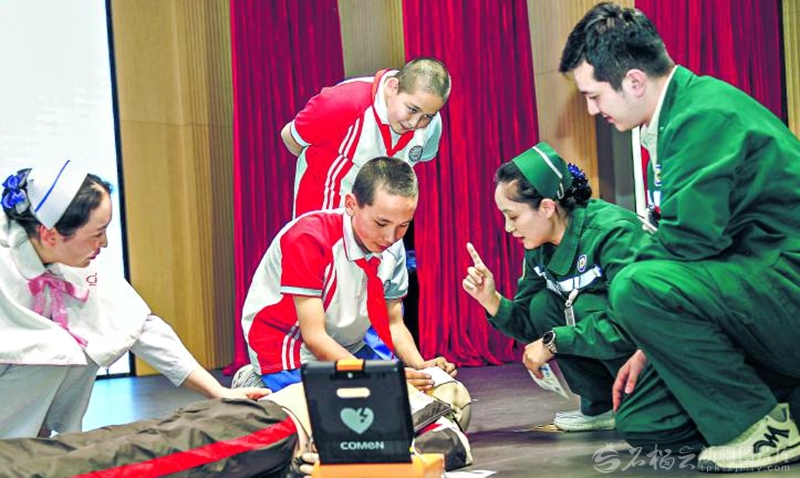 4月7日,医护志愿者在给学生进行急救培训。当日,由乌鲁木齐市天山区和平路街道联合南丁格尔志愿服务队主办的健康进校园活动在兵团第三中学开展。活动聚焦校园实际,通过应急救护知识培训与实操演练,为该校师生送上一堂专业的健康安全课。天山网-新疆日报记者李雄心摄