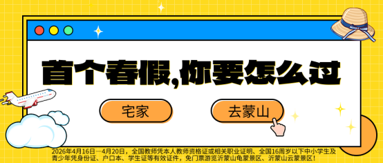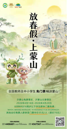 近日,临沂市教育局正式公布2026年中小学春假安排,这也是临沂市首个中小学春假。根据安排,春假时间为4月16日、17日、20日,与4月18日、19日双休日连休,共计5天,让广大中小学生得以暂别作业、网课与补习,尽情享受春日时光。为助力春假文旅消费,让师生群体度过一个有意义的假期,沂蒙山龟蒙景区、沂蒙山云蒙景区特推出系列专属惠民福利,以优质文旅资源与诚意举措,诚邀全国教师、中小学生及广大游客共赴蒙山,赏春景、享乐趣、品文化。
