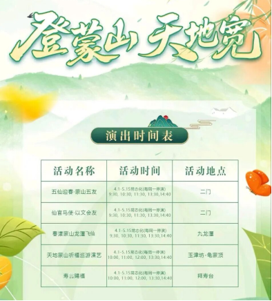 春日的蒙山,山花初绽、万木吐翠、溪水回暖,风携草木清香,构成一幅灵动的春日画卷。为让游客获得沉浸式文旅体验,两大景区精心筹备了丰富多样的特色活动与游玩项目,兼顾观赏性、趣味性与参与感。