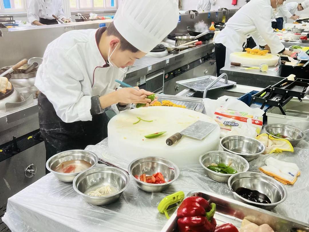 日积月累的训练,是王运昊和伙伴们夺冠的底气。回顾备赛集训期间的付出,王运昊仍记忆犹新。为打磨、提升技艺,他每天清晨 7 点就一头扎进实训室,拿起刀具、厨具,一练就是一整天。翻锅、刀工、火候控制,每一项技能他都反复锤炼,从不松懈。团队伙伴之间互相比拼、互相追赶,谁也不愿落后,老师规定晚上 8 点半放学,大家常常主动留到更晚。2025年暑假期间,王运昊和团队伙伴们放弃休息,指导老师全程陪伴在校,师生同心全力备赛。