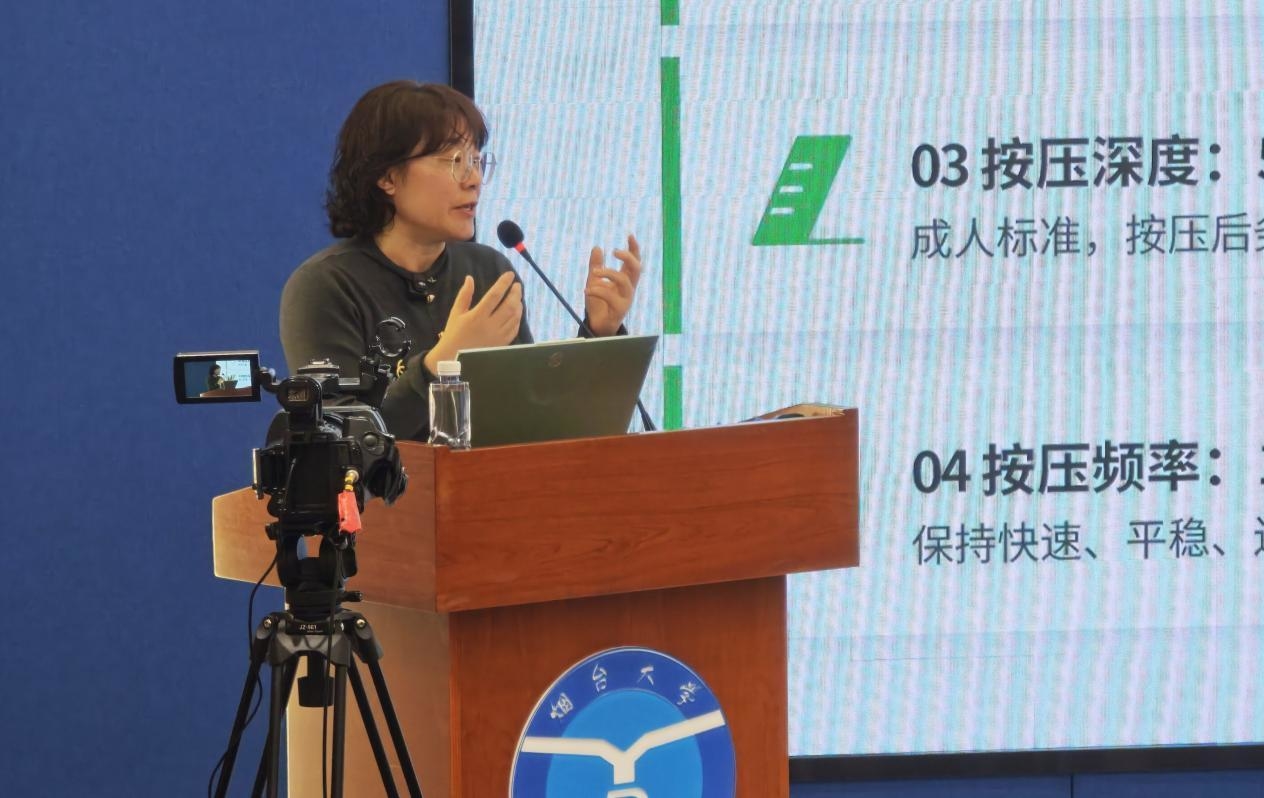 李梅凤凭借二十余年临床急救经验,系统讲授心脏骤停后的心肺复苏(CPR)规范操作步骤及自动体外除颤器(AED)正确使用方法,随行医师现场演示施救细节,重点规范胸外按压的部位、力度、频率及AED电极片粘贴要点,并邀请现场师生代表动手实操。李梅凤全程贴身指导、及时纠正不规范动作,让师生真正掌握可落地、能救命的急救技能。