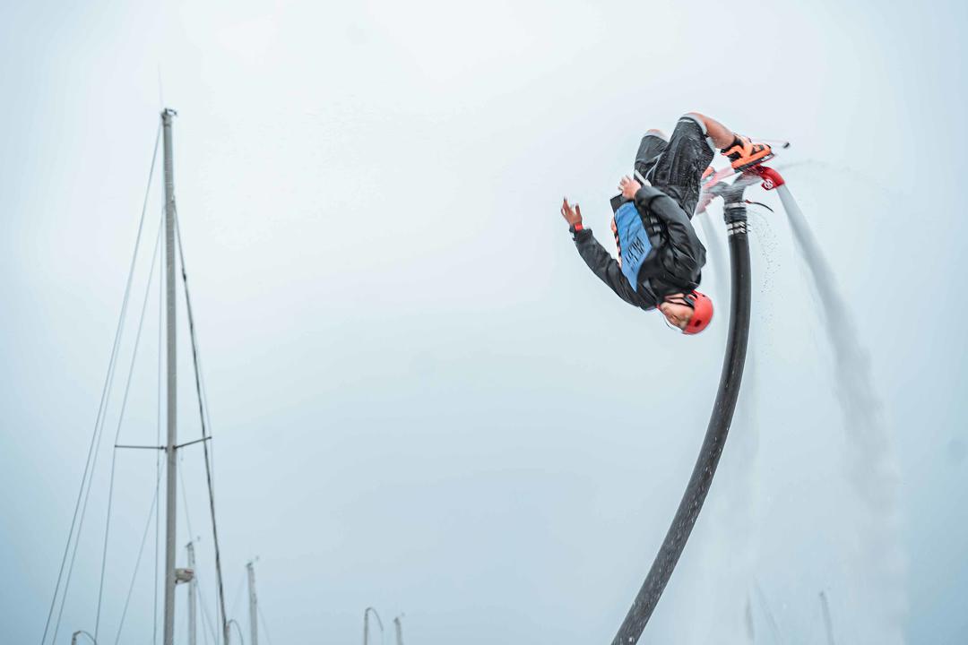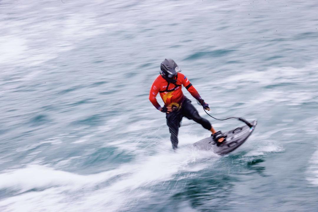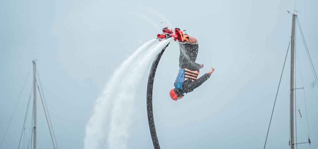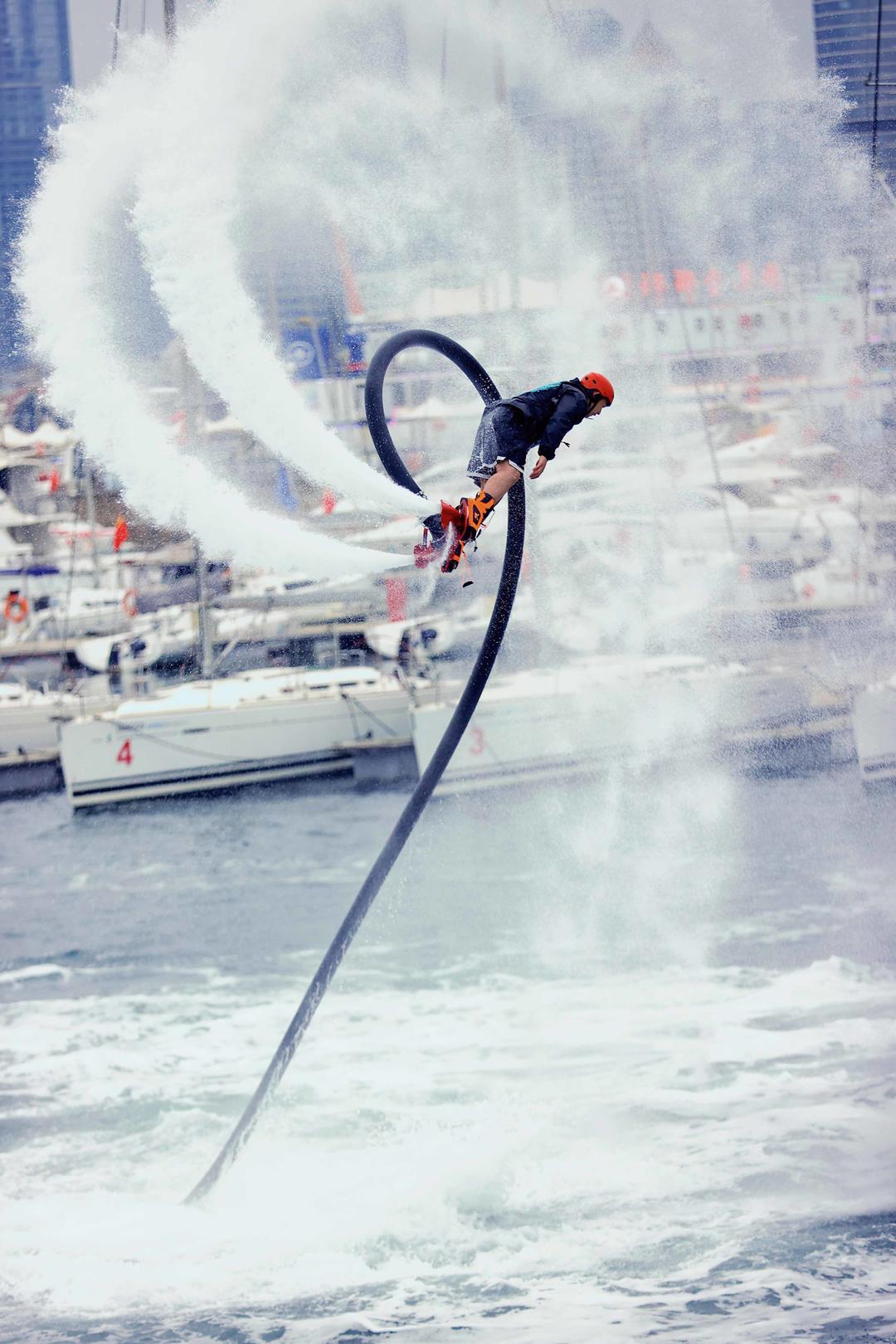 水上飞人是近年流行的水上极限运动,通过喷射式悬浮飞行器连接水上摩托艇的动力装置,利用输水软管向下喷射高压水柱产生的反作用力实现人体空中悬停。