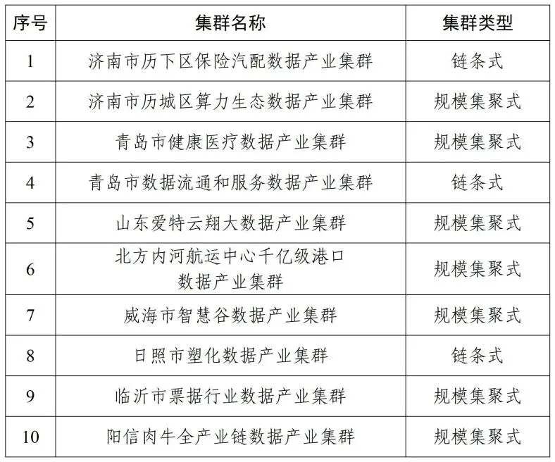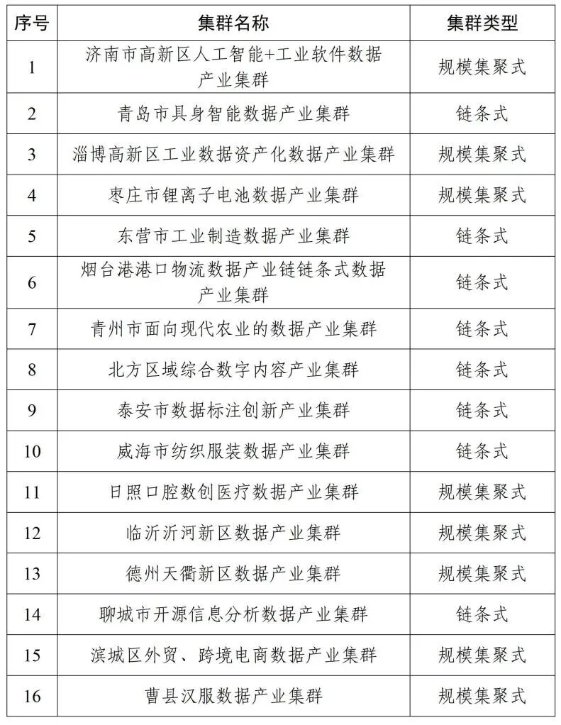 为深入贯彻落实数字强省建设部署要求,加大对数据产业扶持培育力度,省大数据局组织开展了2026年山东省数据产业集群遴选工作。经各单位申报、各市推荐、专家评审和网上公示等程序,确定将8个规模集聚式产业集群、8个链条式产业集群纳入2026年山东省数据产业集群建设名单,并对10个数据产业集群进行培育储备。现将有关名单予以公布。