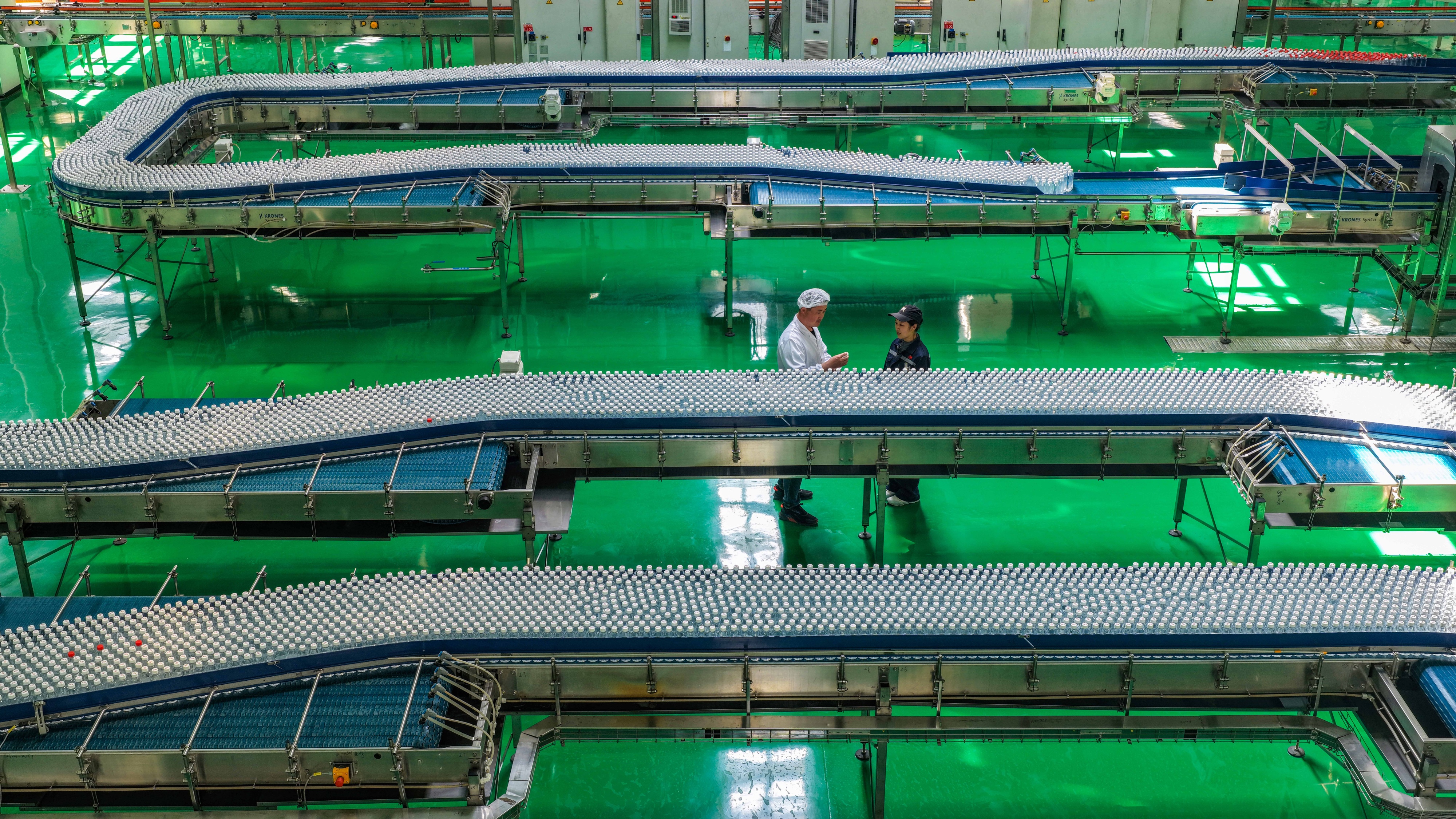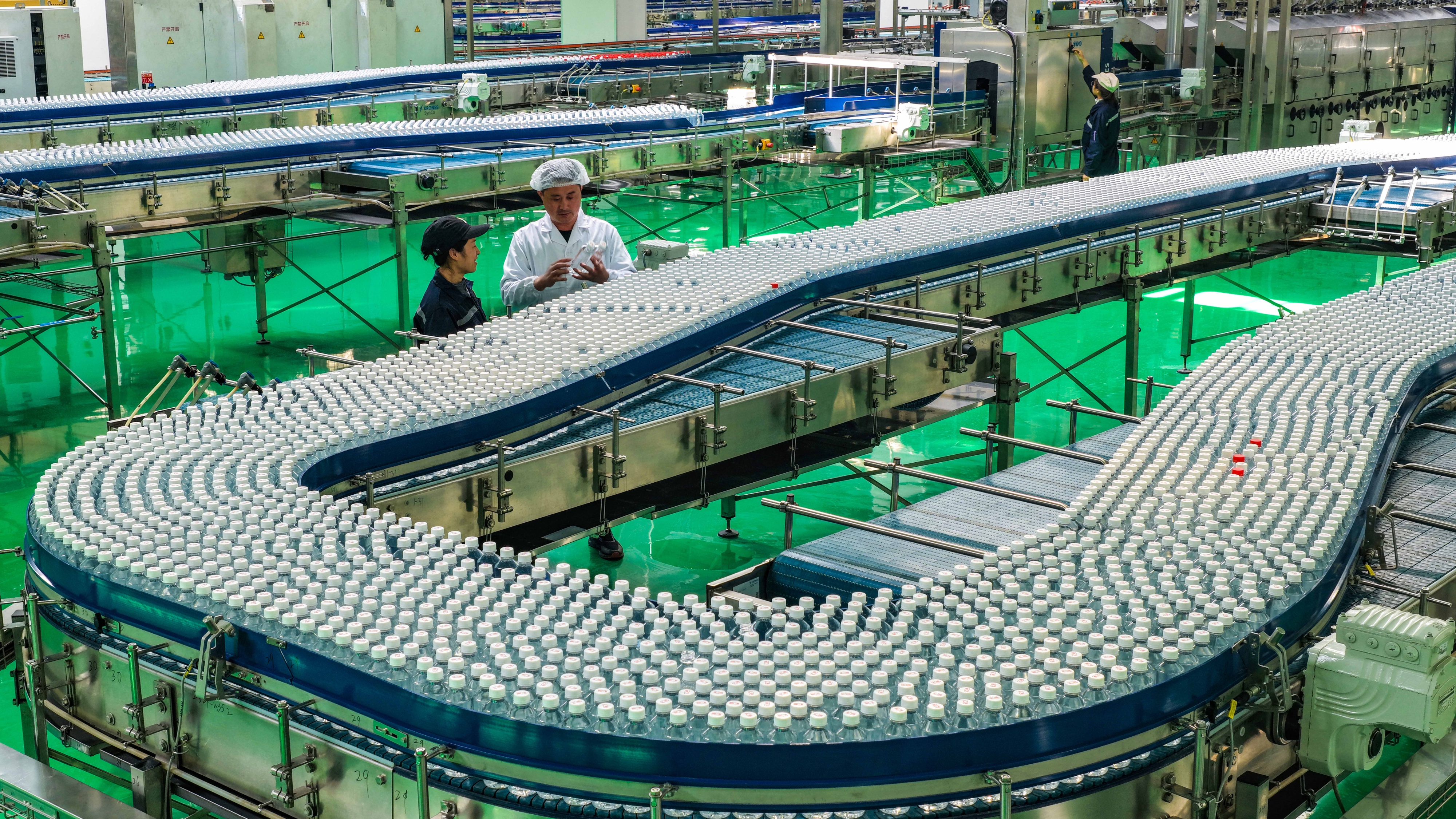 4月10日,山东省乐陵市汇源果汁数字化生产车间内,技术工人在瓶装饮品自动生产线旁巡检,把控产品质量。