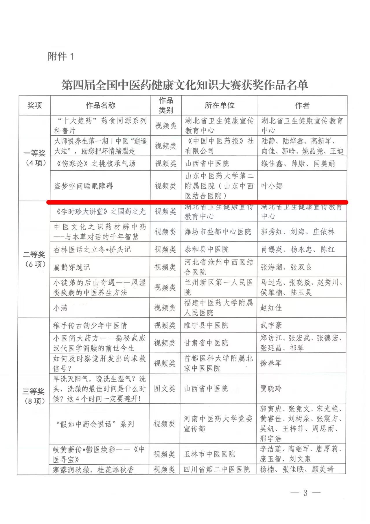 近日,由国家中医药管理局委托、中国中医药出版社主办的第四届全国中医药健康文化知识大赛落幕。山东中医药大学第二附属医院(山东省中西医结合医院)治未病科叶小娜牵头创作的科普作品《盗梦空间·睡眠障碍》获大赛一等奖。