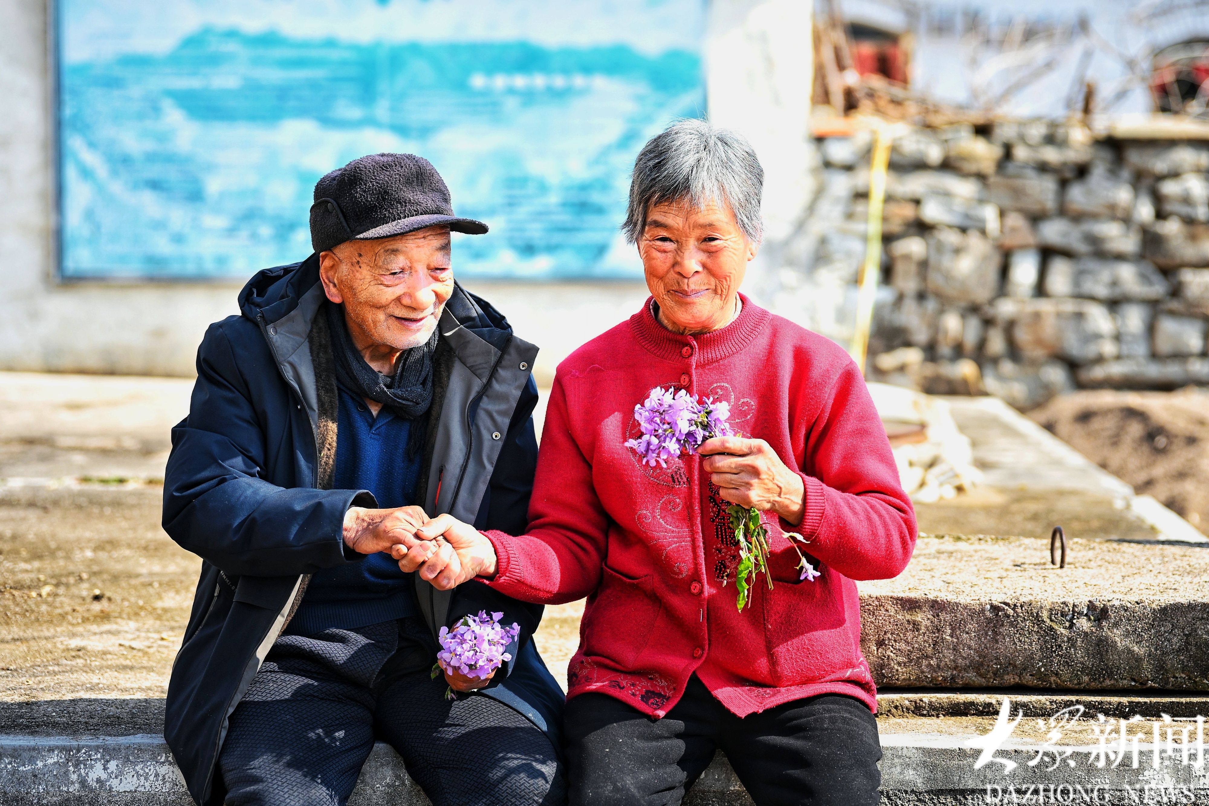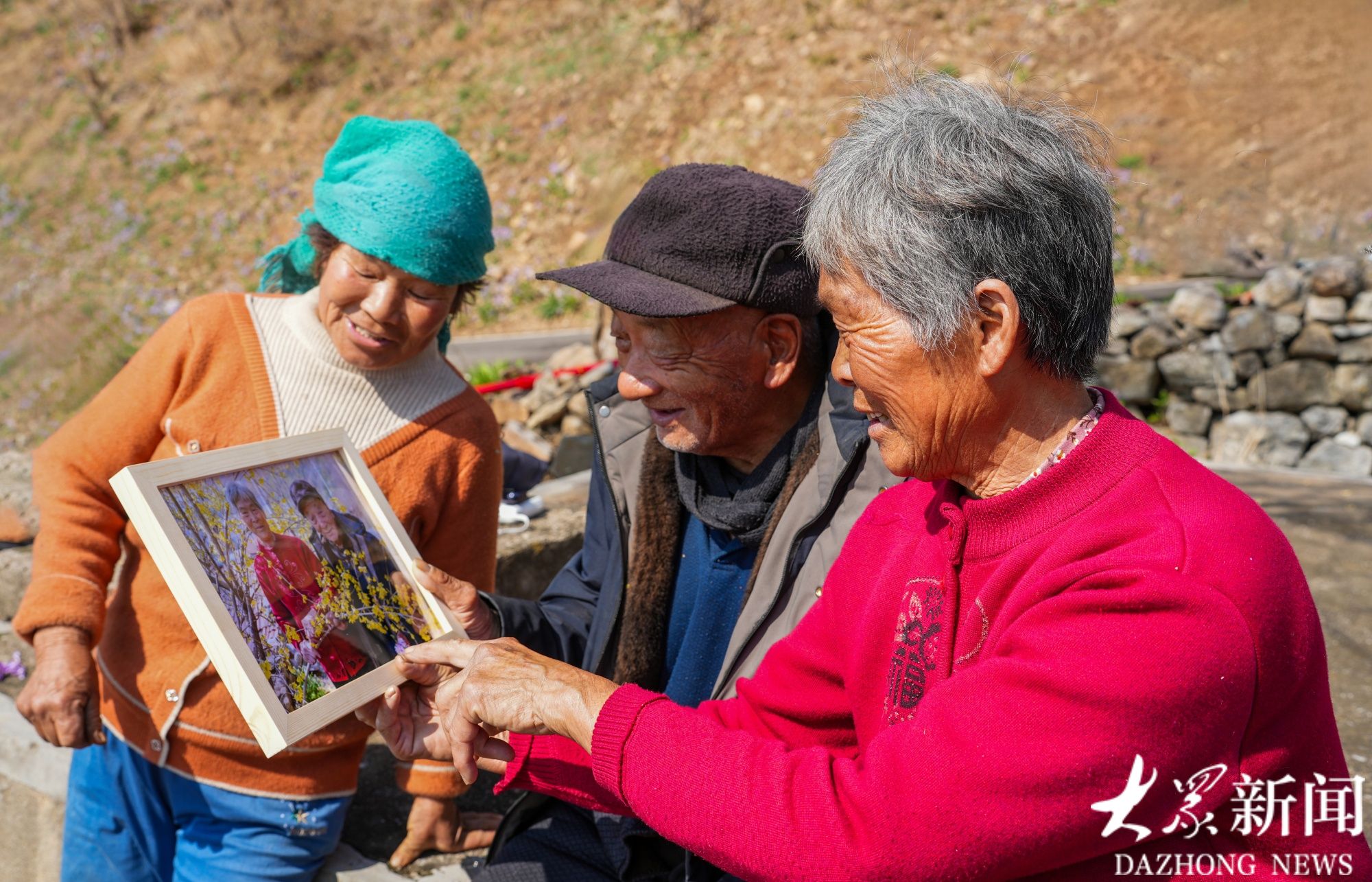 78岁的李兴兰手捧一束鲜花,温柔地给同龄的许长凤别在发间。许长凤嘴上念叨着“老了还戴花”,却悄悄把头凑过去,眼角的皱纹挤成了温柔的褶皱,那份腼腆与羞涩,恰似十八九岁的少女模样 。一旁的老人纷纷凑趣,你为我插一朵花,我为你理一理鬓发,满山坡的笑声,被三位摄影师一一收进镜头。