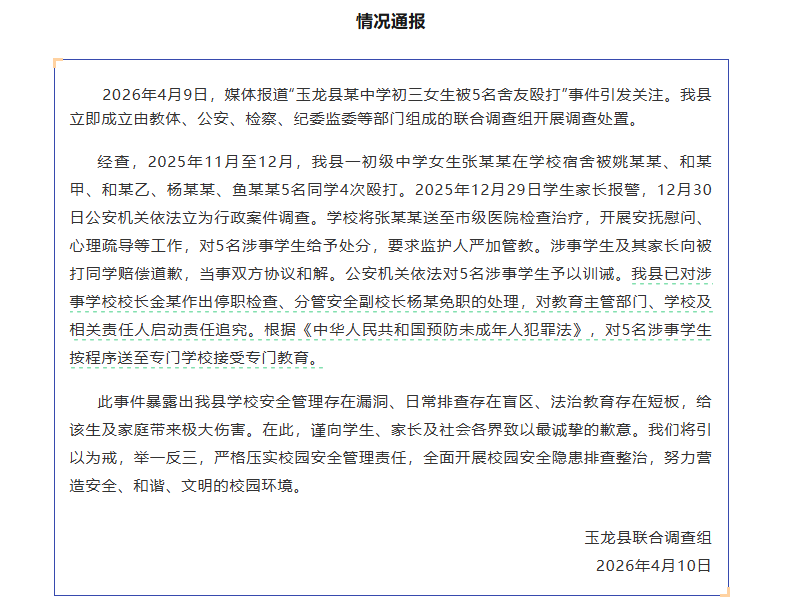 2026年4月9日,媒体报道“玉龙县某中学初三女生被5名舍友殴打”事件引发关注。我县立即成立由教体、公安、检察、纪委监委等部门组成的联合调查组开展调查处置。