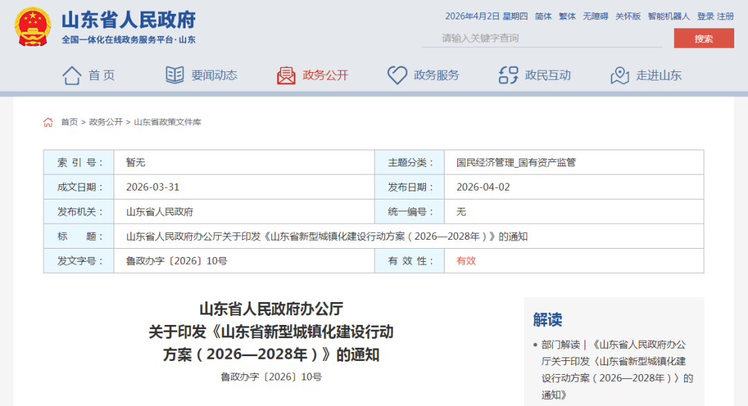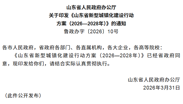 近日,山东省人民政府办公厅关于印发《山东省新型城镇化建设行动方案(2026—2028年)》的通知,