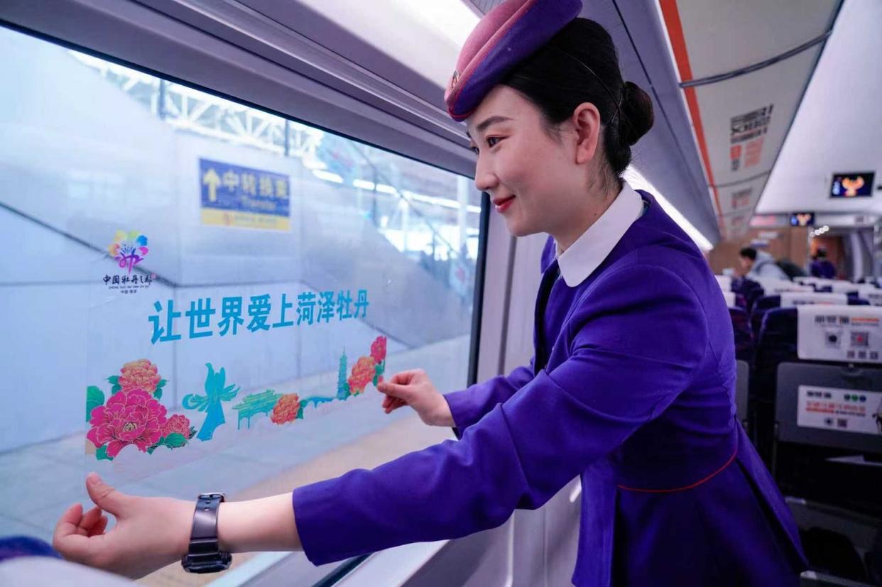 This special train service includes two trains, G2097 and C665, operating from April 10 to May 10. On the launch day, the train adopts the theme "Take High-Speed Rail・Admire National Beauty・Explore Heze". Integrating peony culture and intangible cultural heritage features, it creates an immersive travel experience through themed decorations, specialty cuisines, cultural presentations and heritage displays.