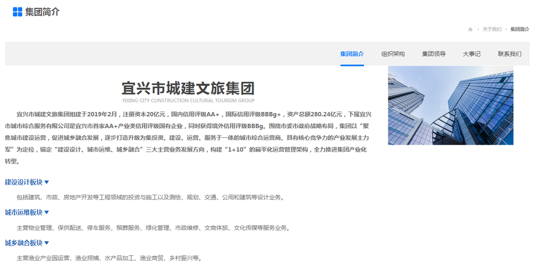 据宜兴城建文旅集团官网介绍,公司资产总额280.24亿元,下属宜兴市城市综合服务有限公司是宜兴市首家AA+产业类信用评级国有企业,同时获得境外信用评级BBBg。公司以“聚焦城市建设运营,促进城乡融合发展,逐步打造升级为集投资、建设、运营、服务于一体的城市综合运营商、具有核心竞争力的产业发展主力军”为定位,有建设设计、城市运维、城乡融合三大主营业务发展方向。