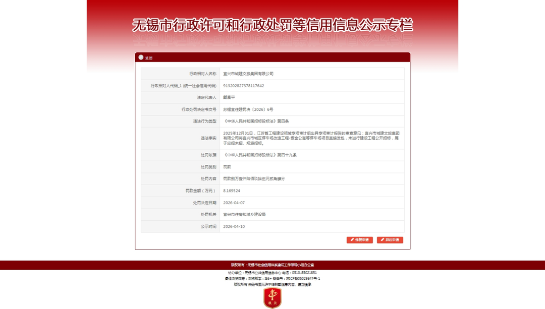 苏锡宜住建罚决〔2026〕6号内容则显示,2025年12月31日,江苏省工程建设领域专项审计组出具专项审计报告的审查意见,宜兴城建文旅集团将宜兴市城区停车场改造工程-紫金公寓等停车场项目直接发包,未进行建设工程公开招标,属于应招未招、规避招标。