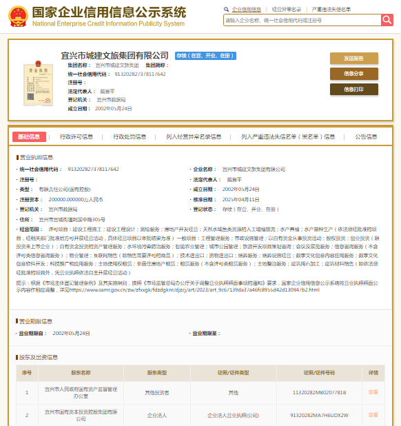国家企业信用信息公示系统显示,宜兴市城建文旅集团有限公司成立于2002年,注册资本200000万元人民币,法定代表人戴赛平,大股东为宜兴市国有资本投资控股集团有限公司。