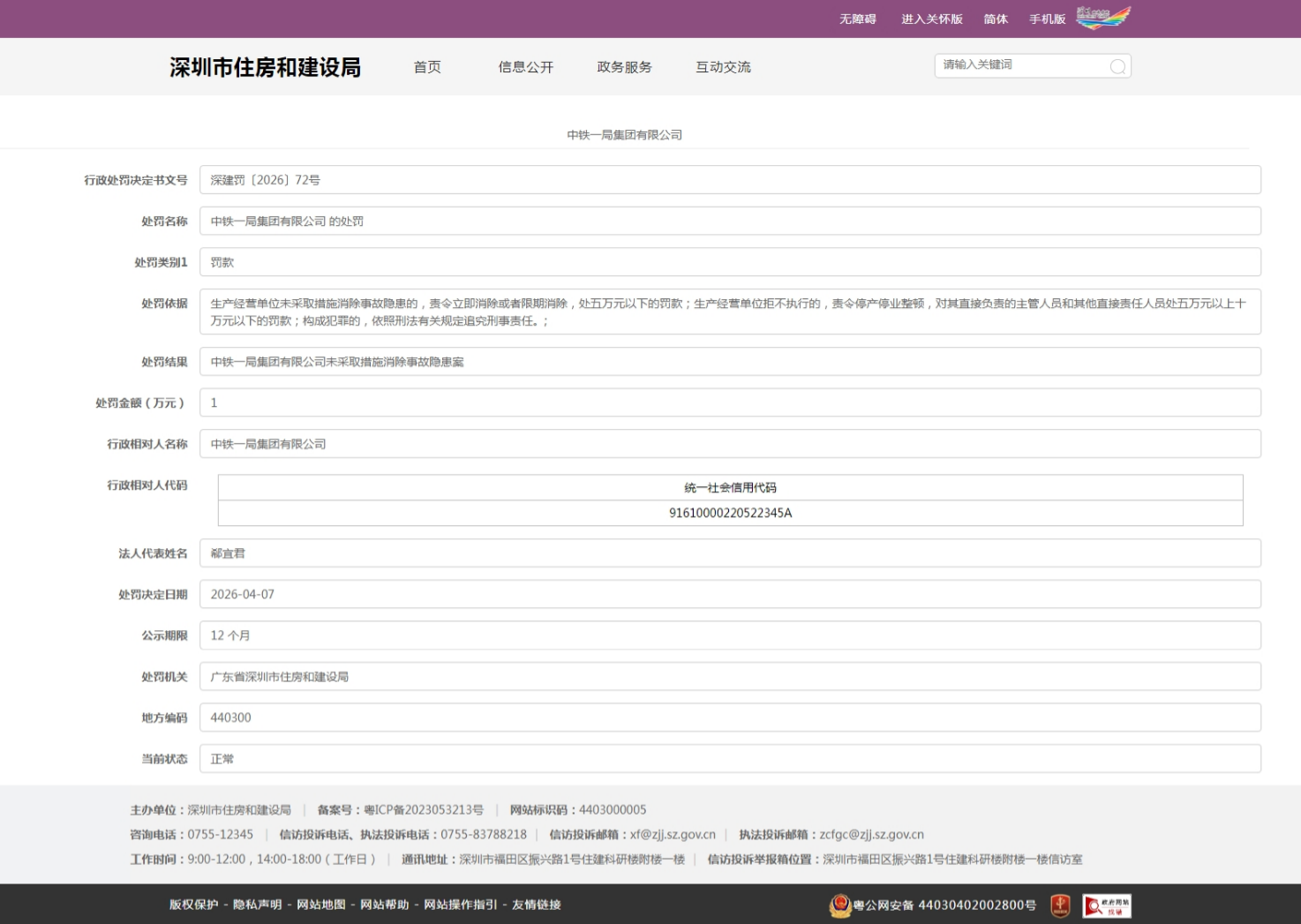 内容显示,其案由是“未采取措施消除事故隐患案”。对此,深圳市住房和建设局对中铁一局作出罚款人民币1万元整的行政处罚。行政处罚决定书文号:深建罚〔2026〕72号。